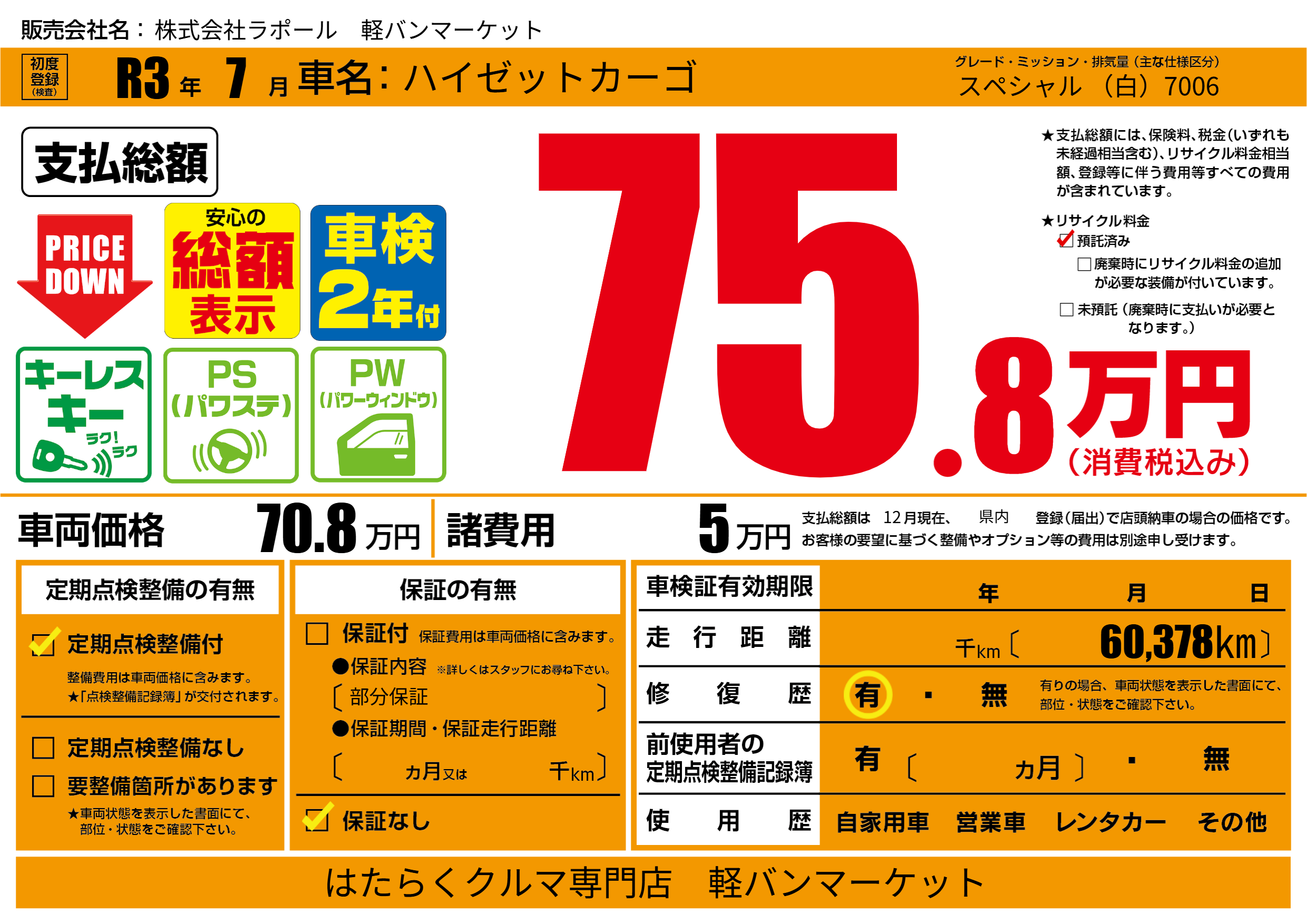 保証なし 保証内容(部分保証) ---ヶ月または()千kmまで |