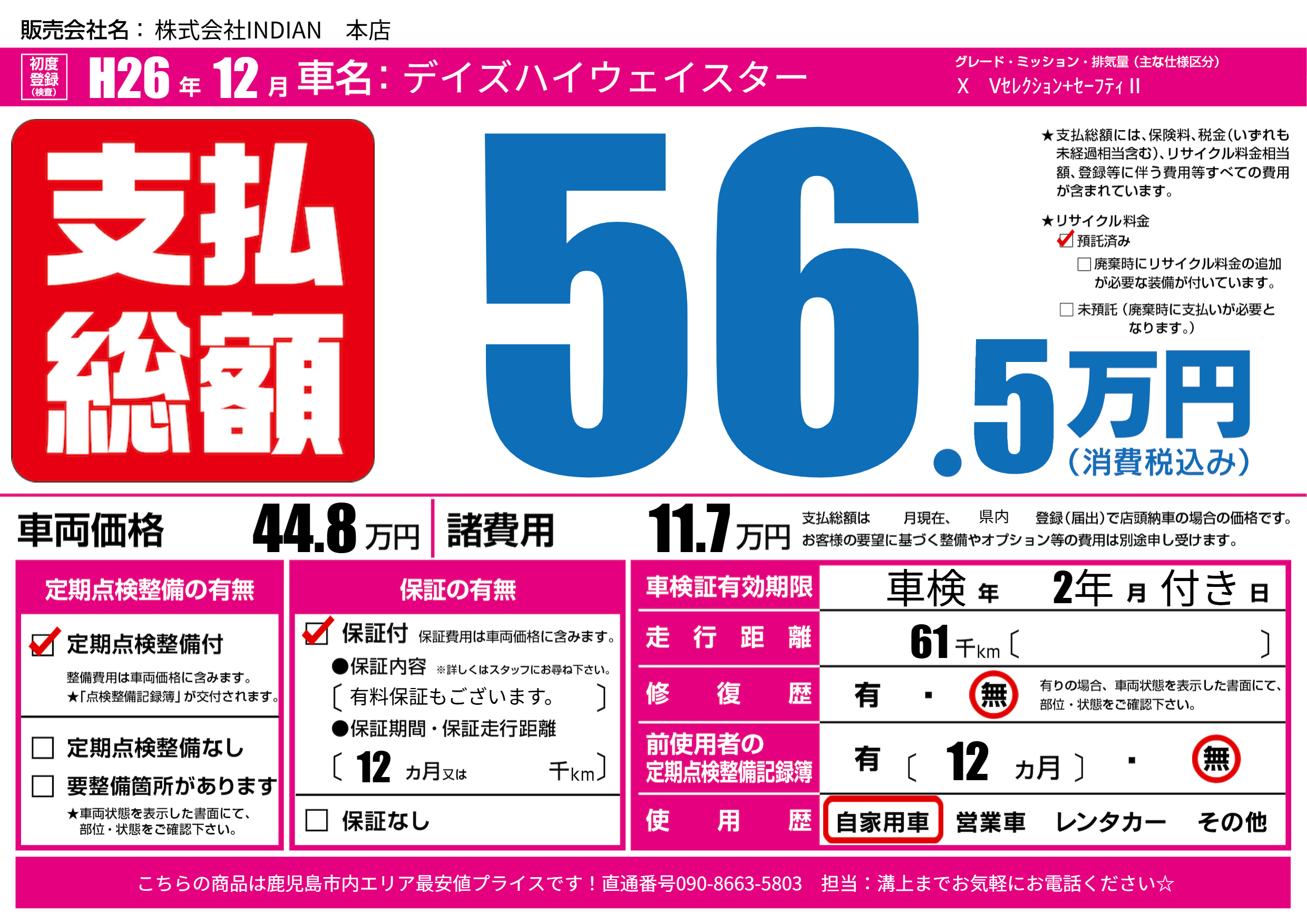 | 走行キロ | 6.1万km | 初年度登録 | H26年12月 |