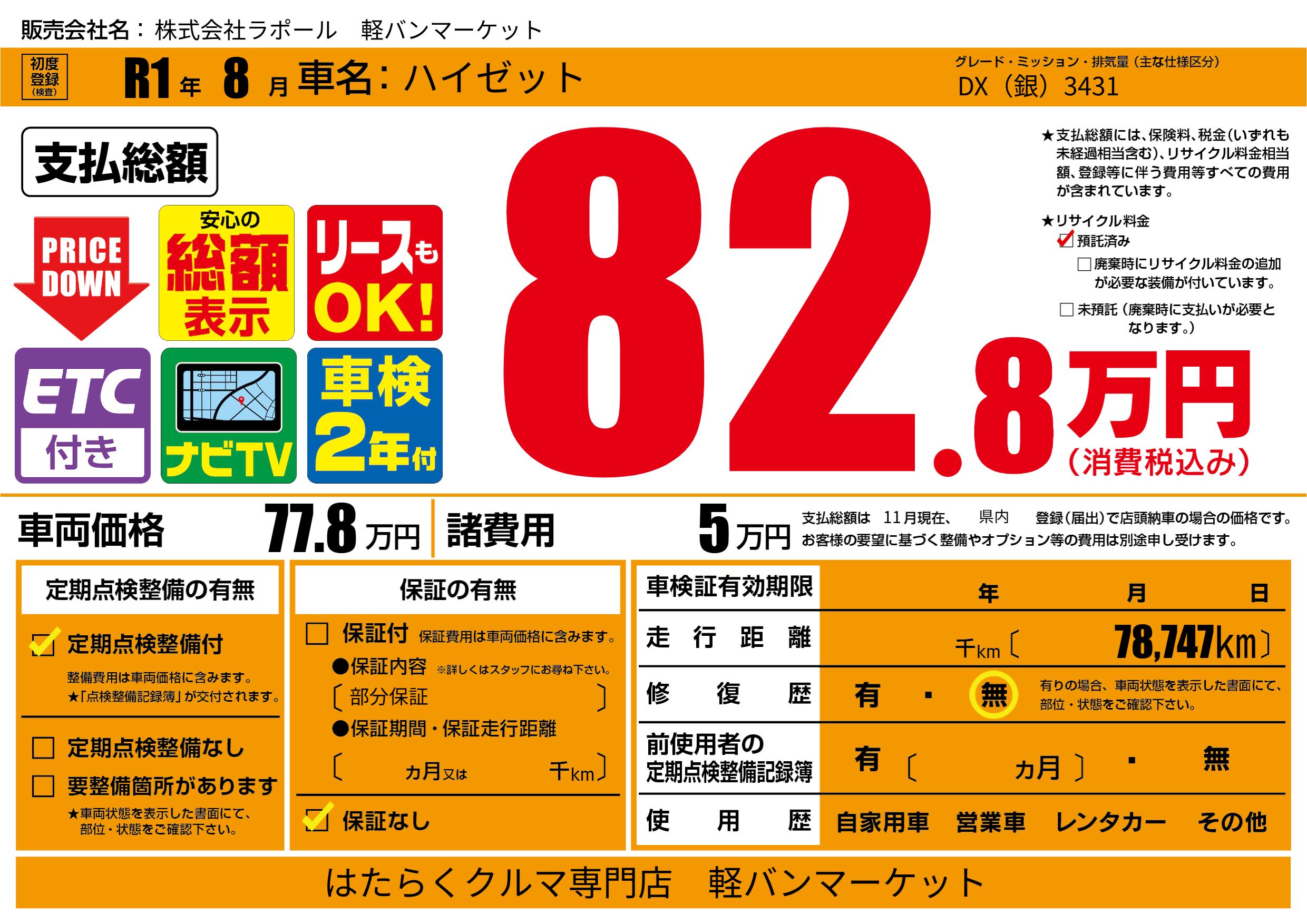 | 車名 | ハイゼット | グレード ミッション 排気量 |