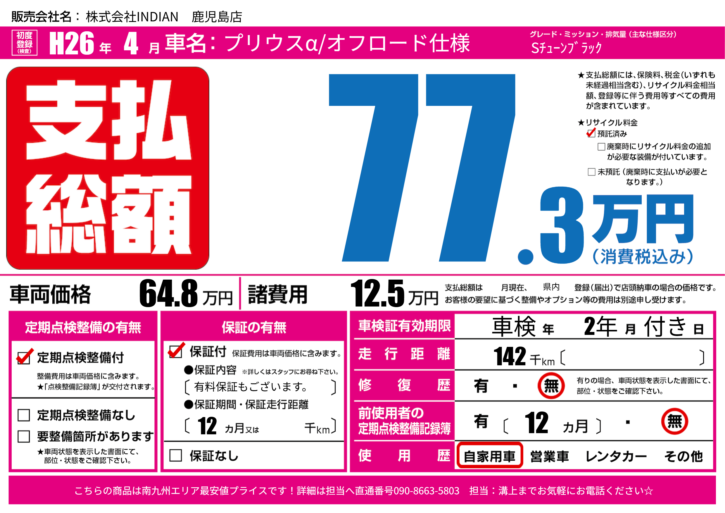| 走行キロ | 14.2万km | 初年度登録 | H26年4月 |