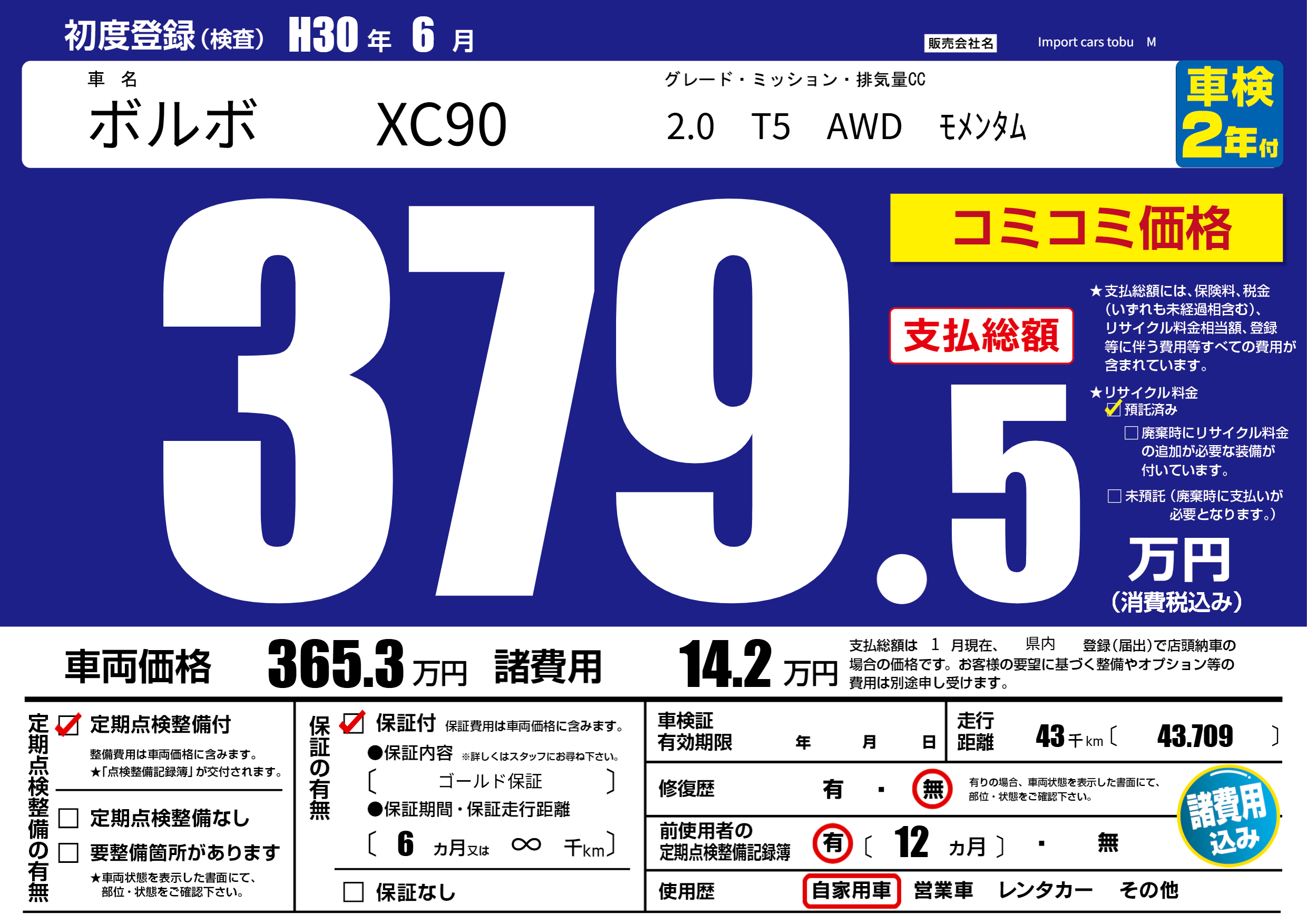 | 車名 | ボルボ XC90 | グレード ミッション 排気量 |