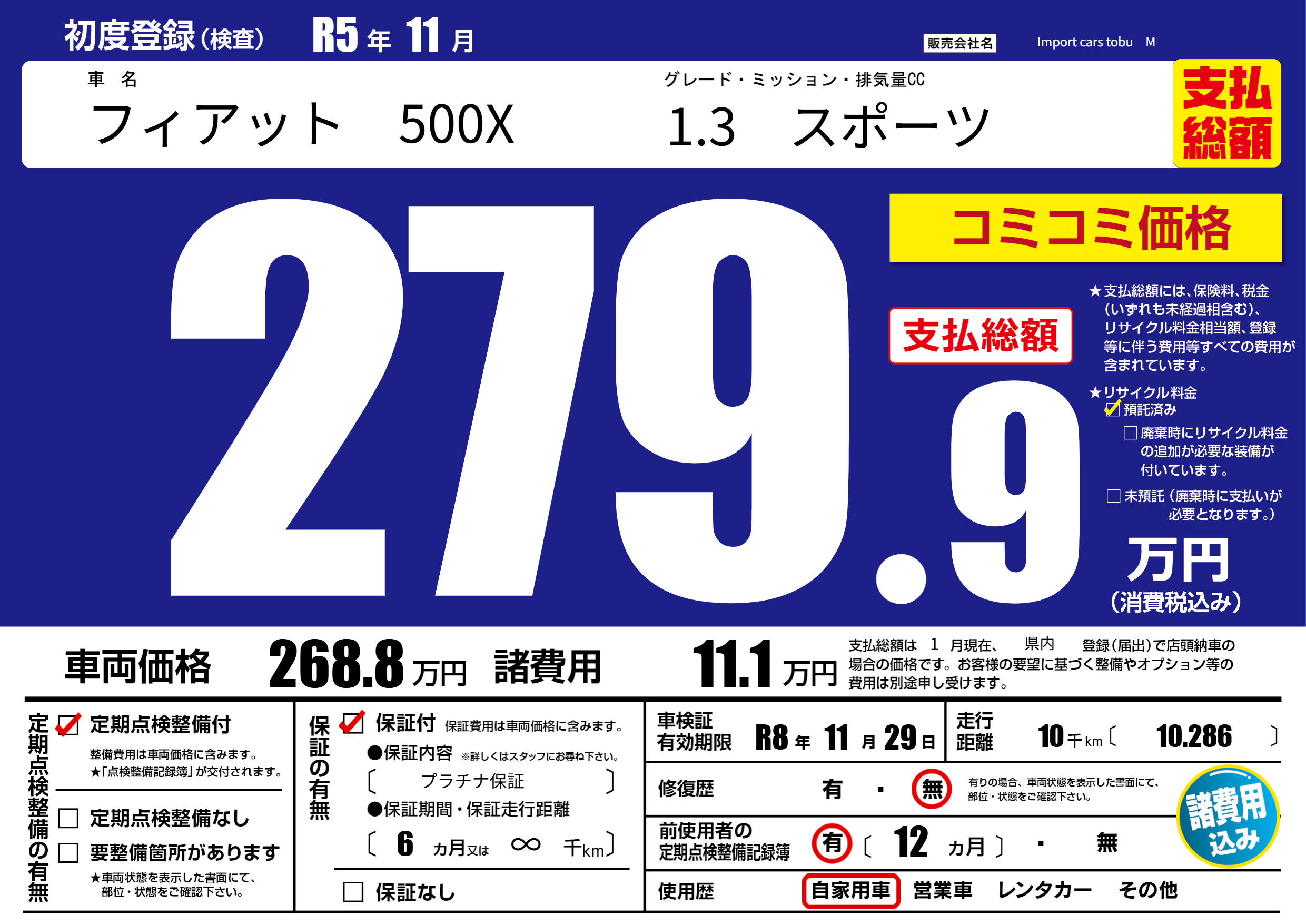 | 車名 | フィアット 500X | グレード ミッション 排気量 |