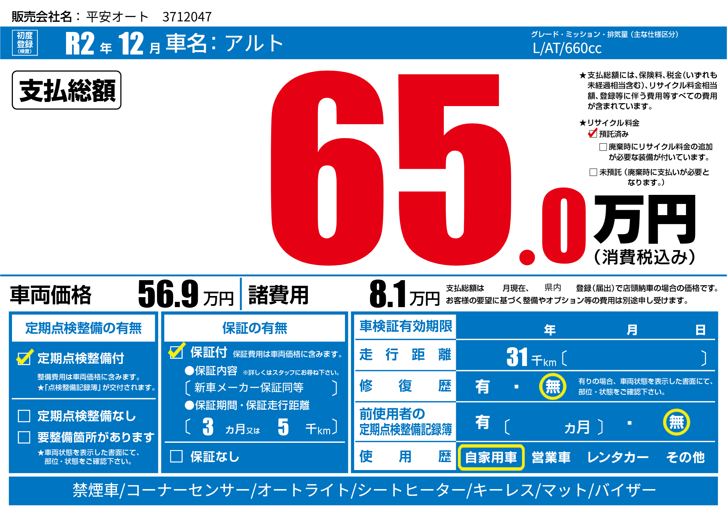 | 定期点検整備 | 定期点検整備あり | ||