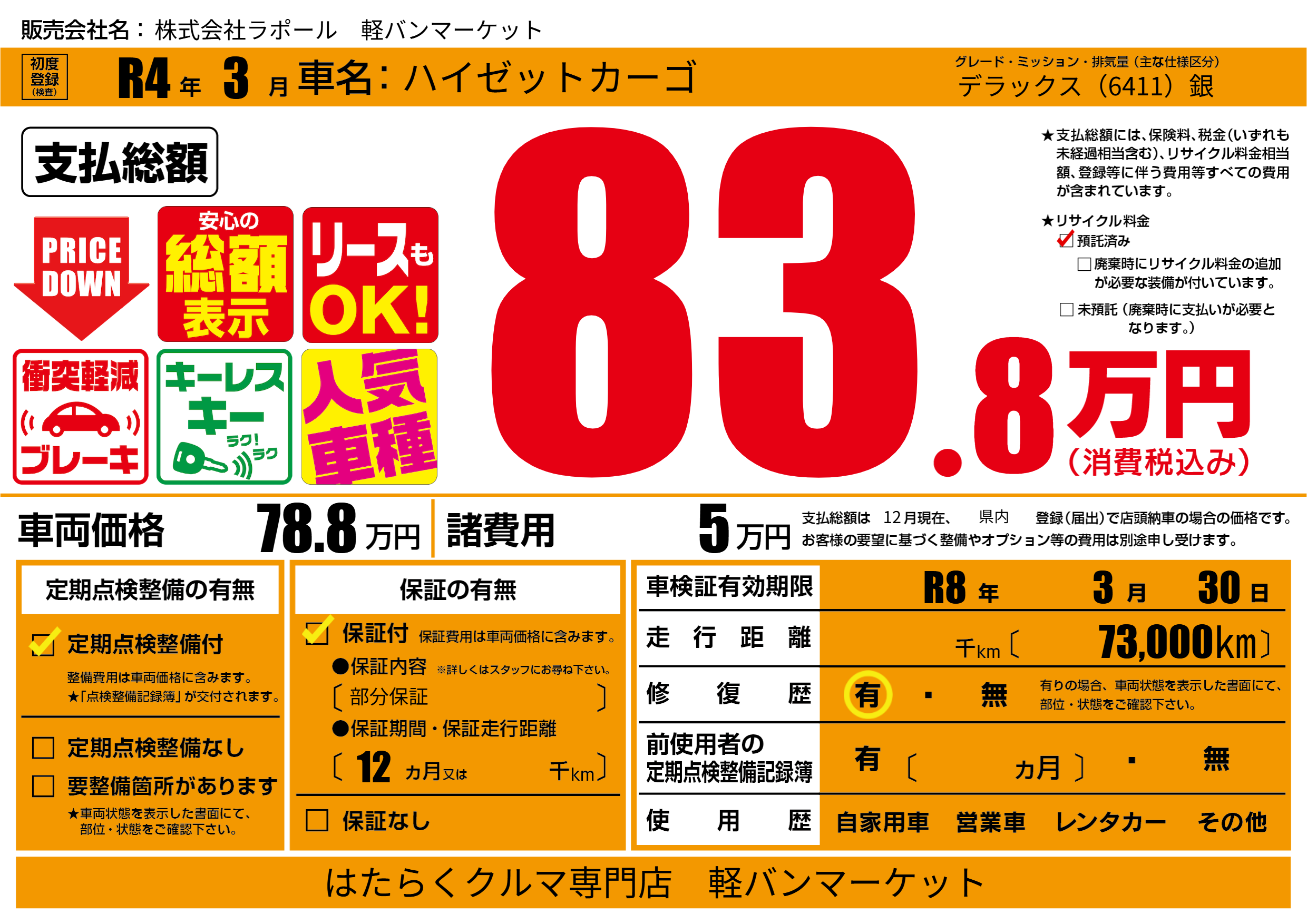 | 車名 | ハイゼットカーゴ | グレード ミッション 排気量 |
