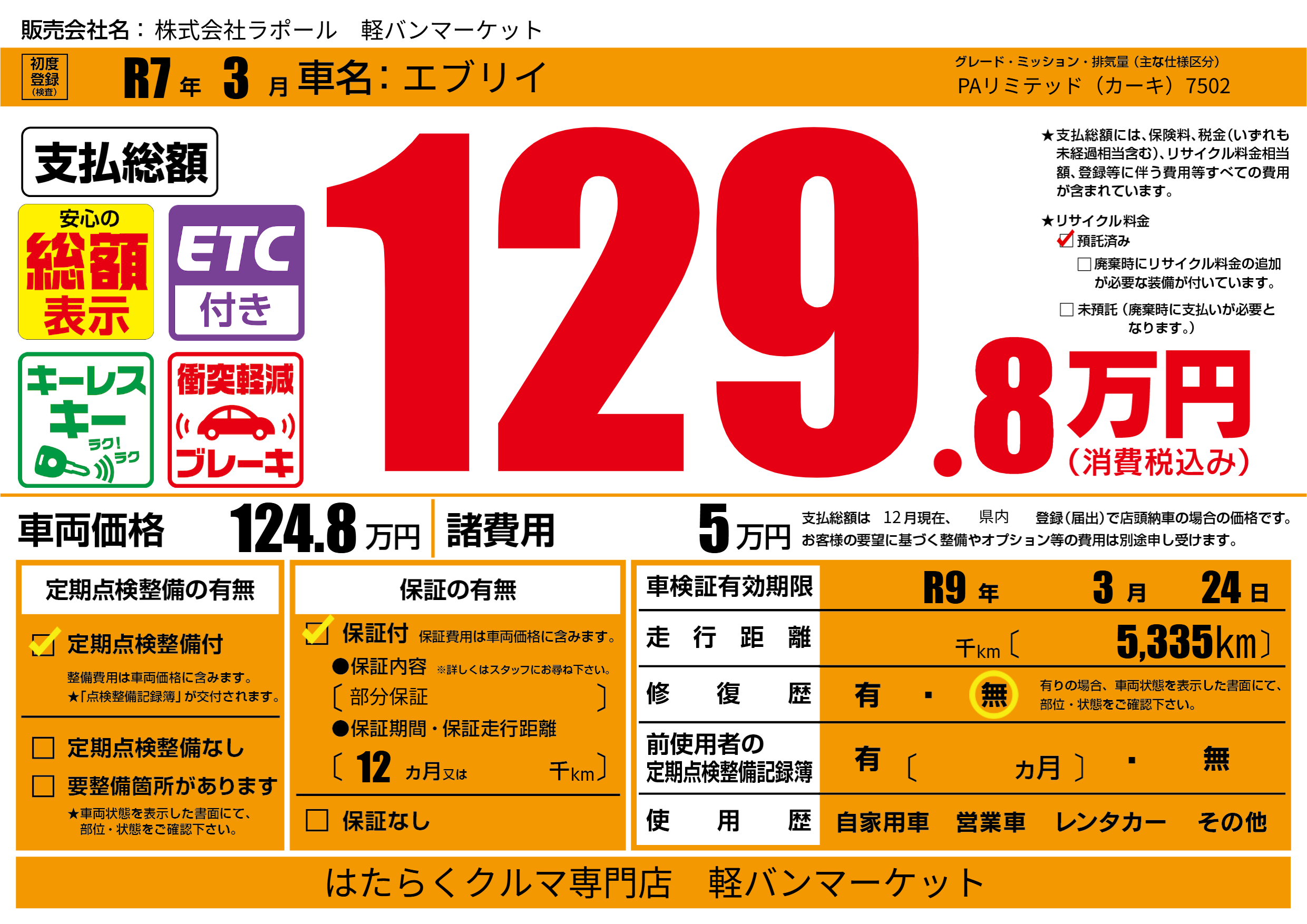 | 走行キロ | - | 初年度登録 | R7年3月 |