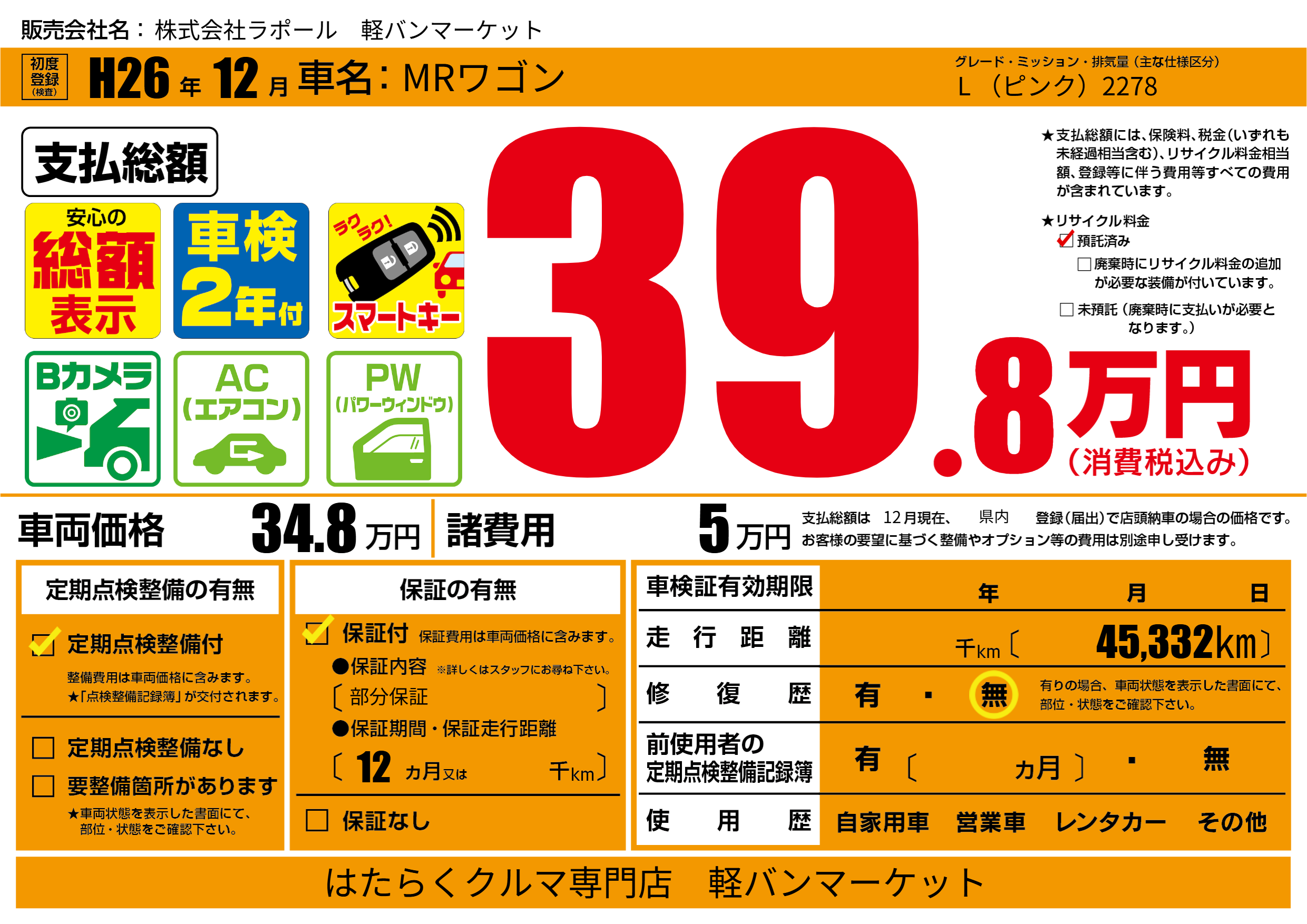 | 走行キロ | - | 初年度登録 | H26年12月 |