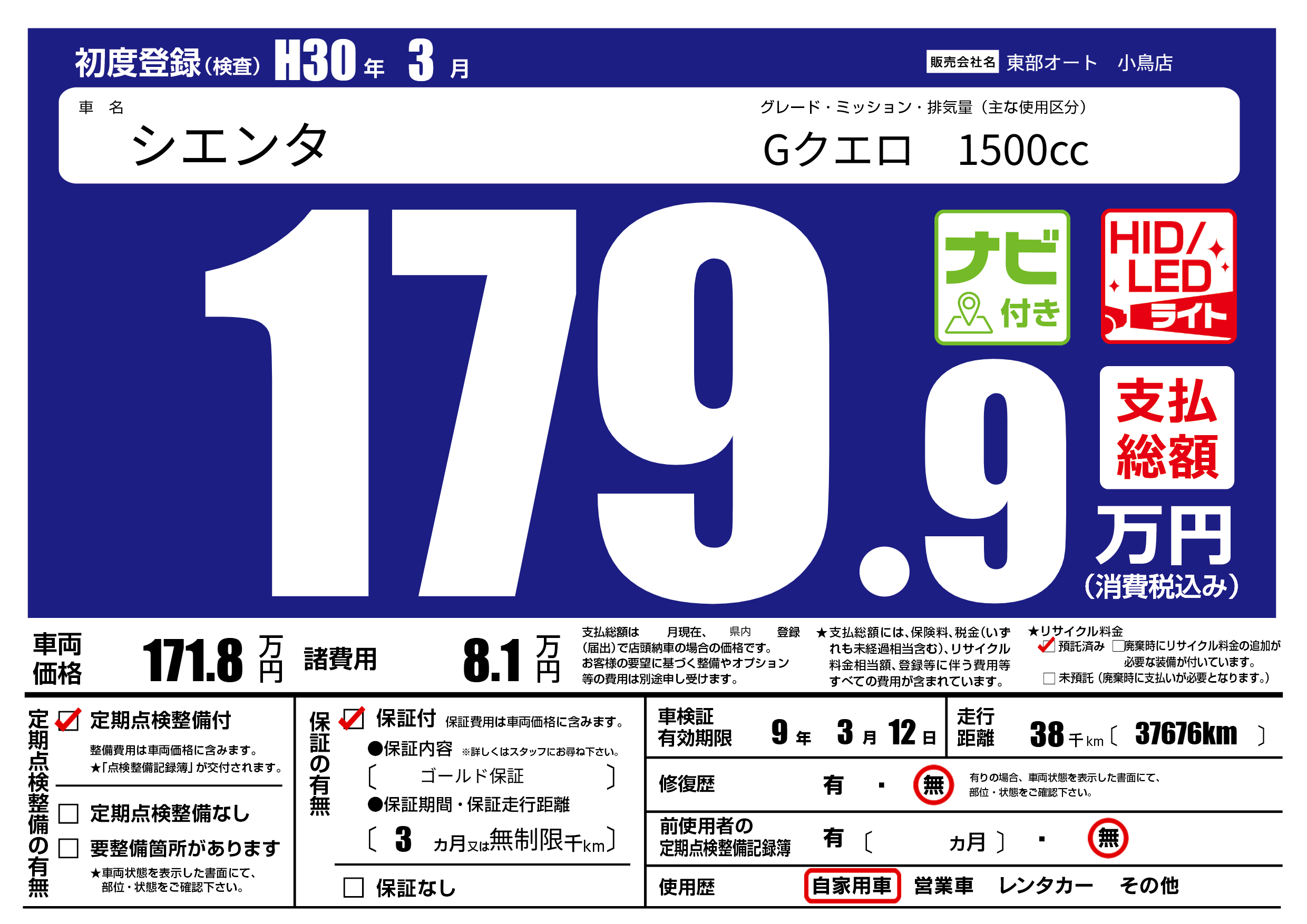 | 車名 | シエンタ | グレード ミッション 排気量 |