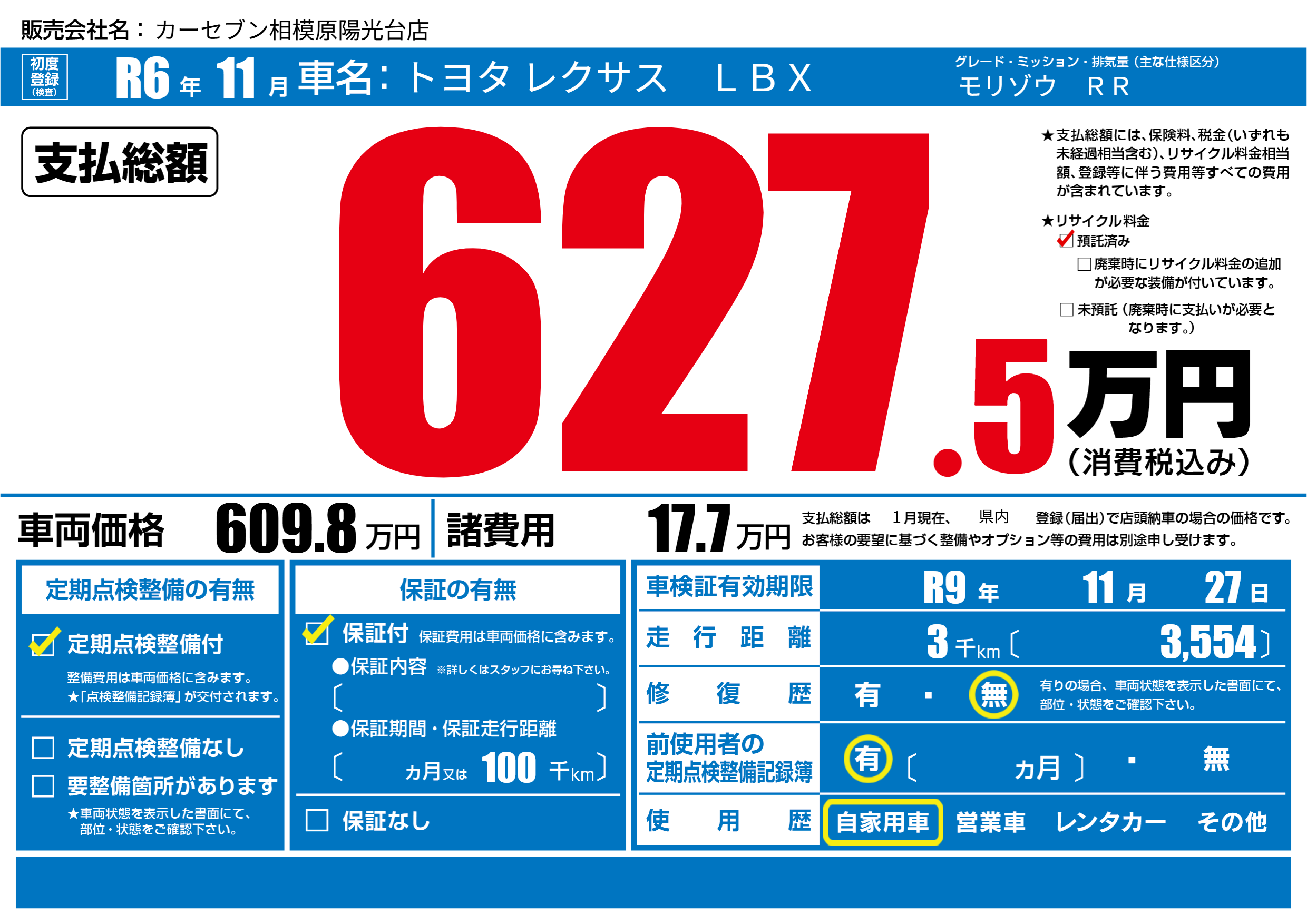 | 車名 | トヨタ レクサス LBX | グレード ミッション 排気量 |