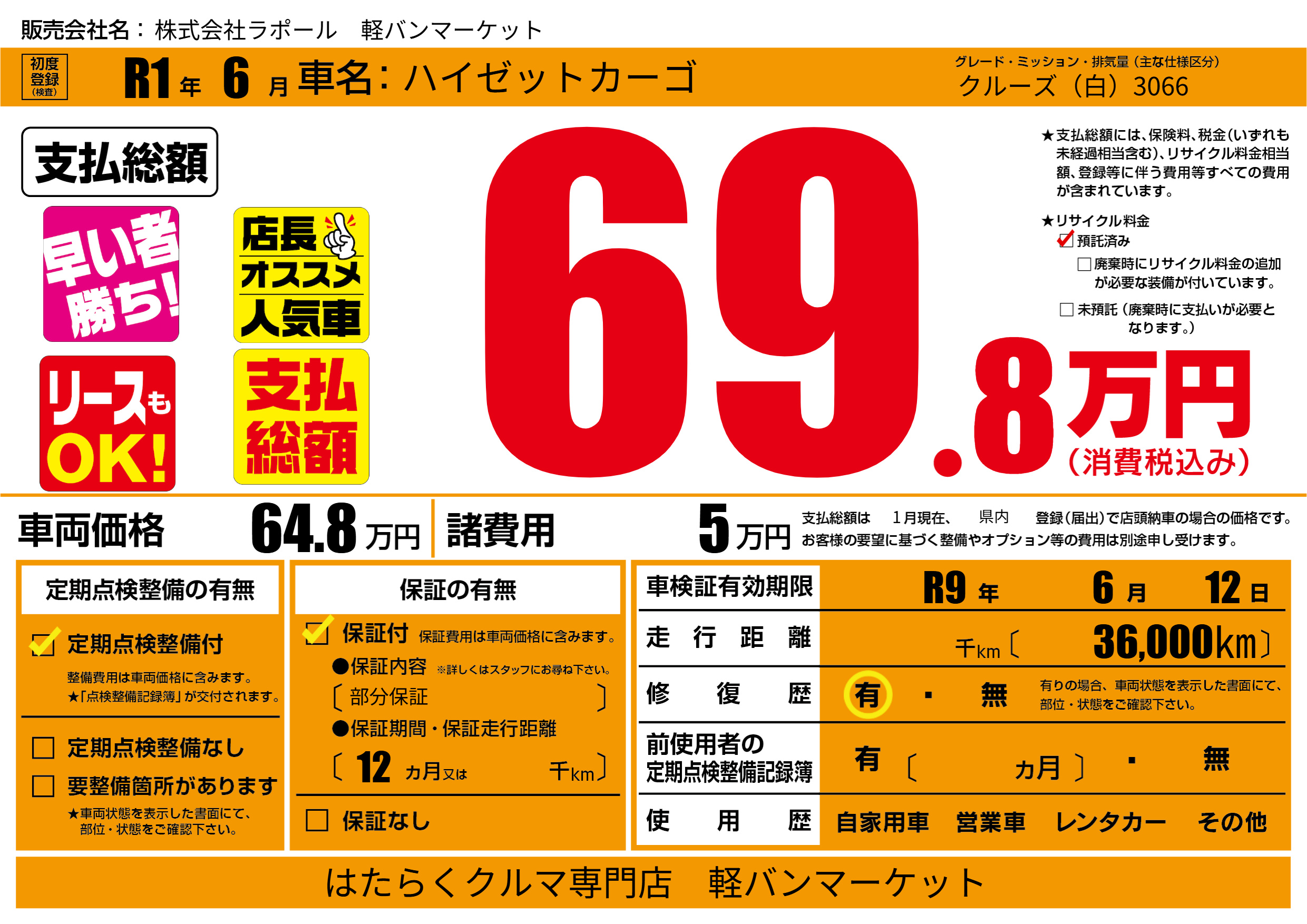 なし | 車検制限 | R9年6月12月 |