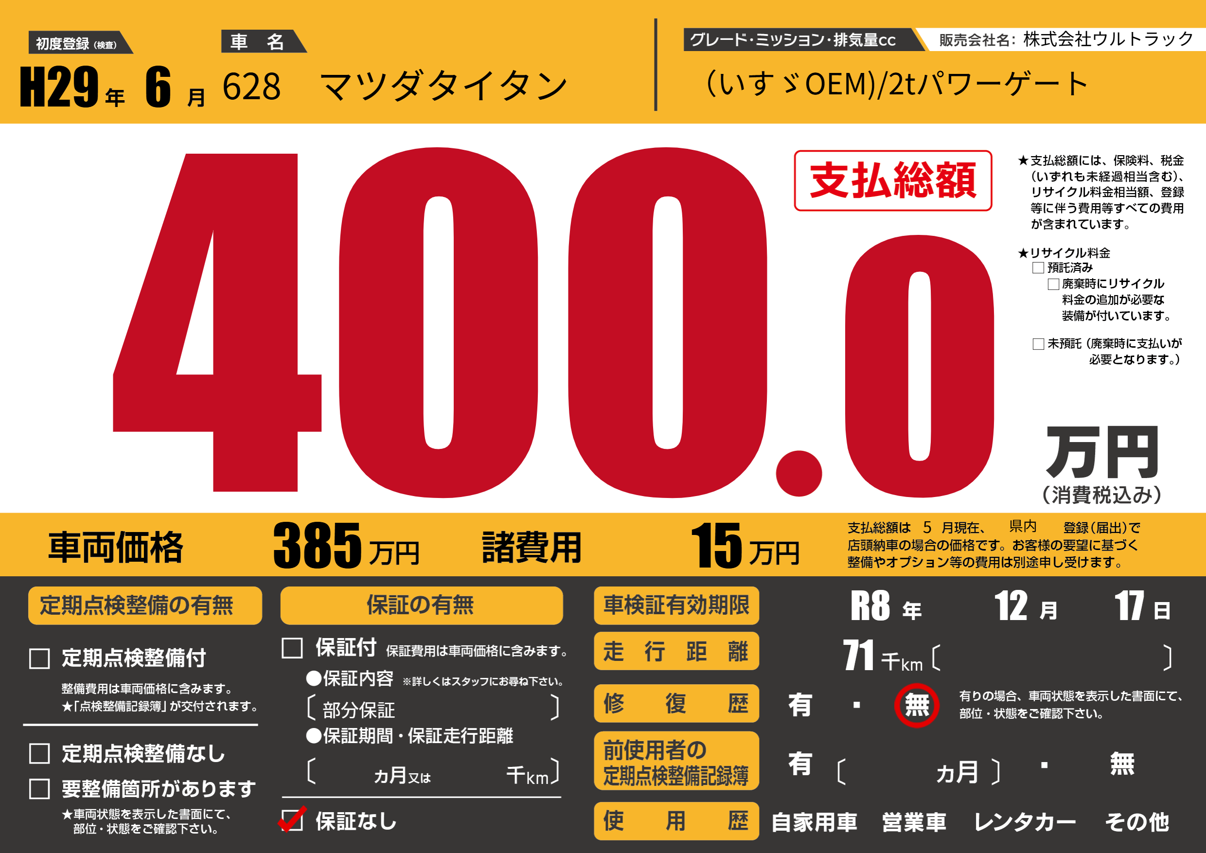 保証なし 保証内容(部分保証) ---ヶ月または()千kmまで |