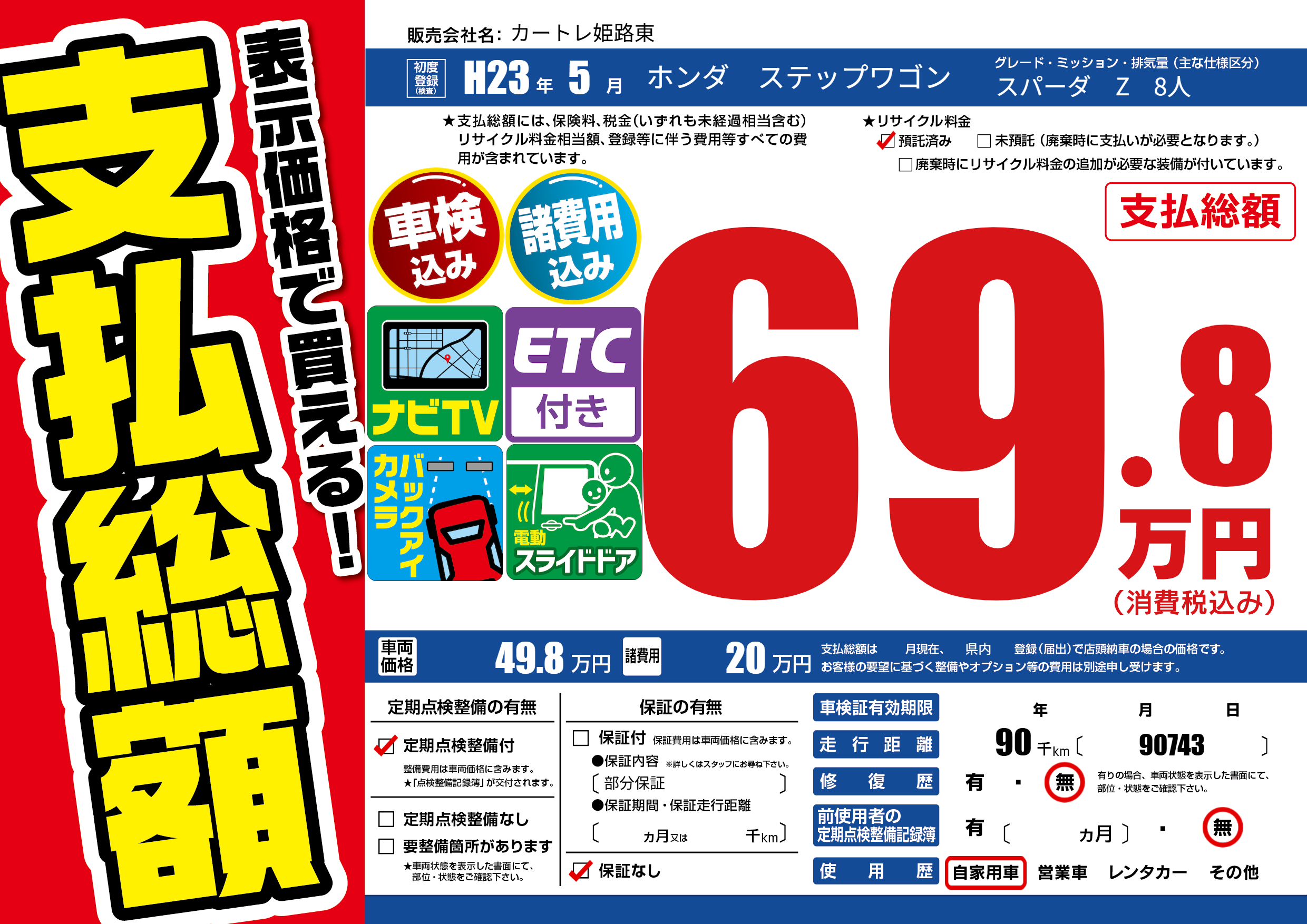 | 走行キロ | 9万km | 初年度登録 | H23年5月 |