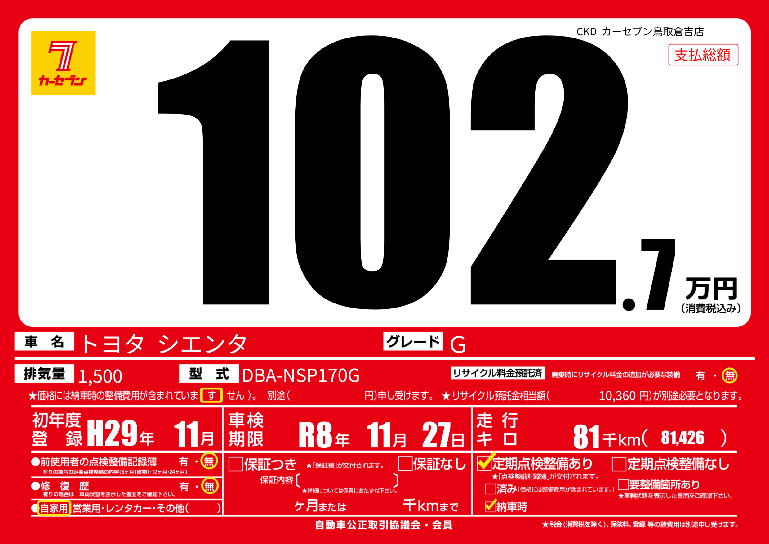 | 車名 | トヨタ シエンタ | グレード ミッション 排気量 |