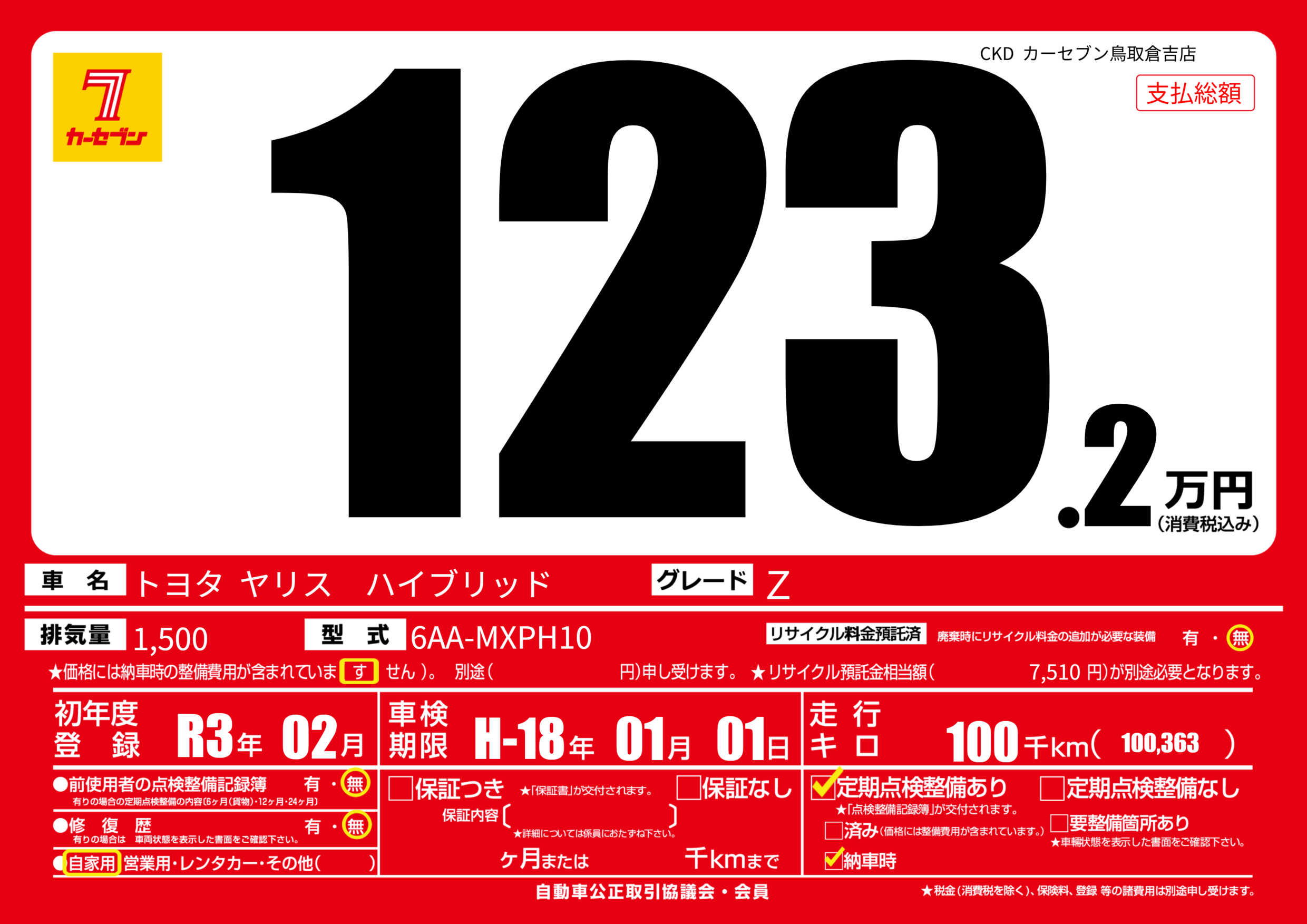 | 走行キロ | 10万km | 初年度登録 | R3年02月 |
