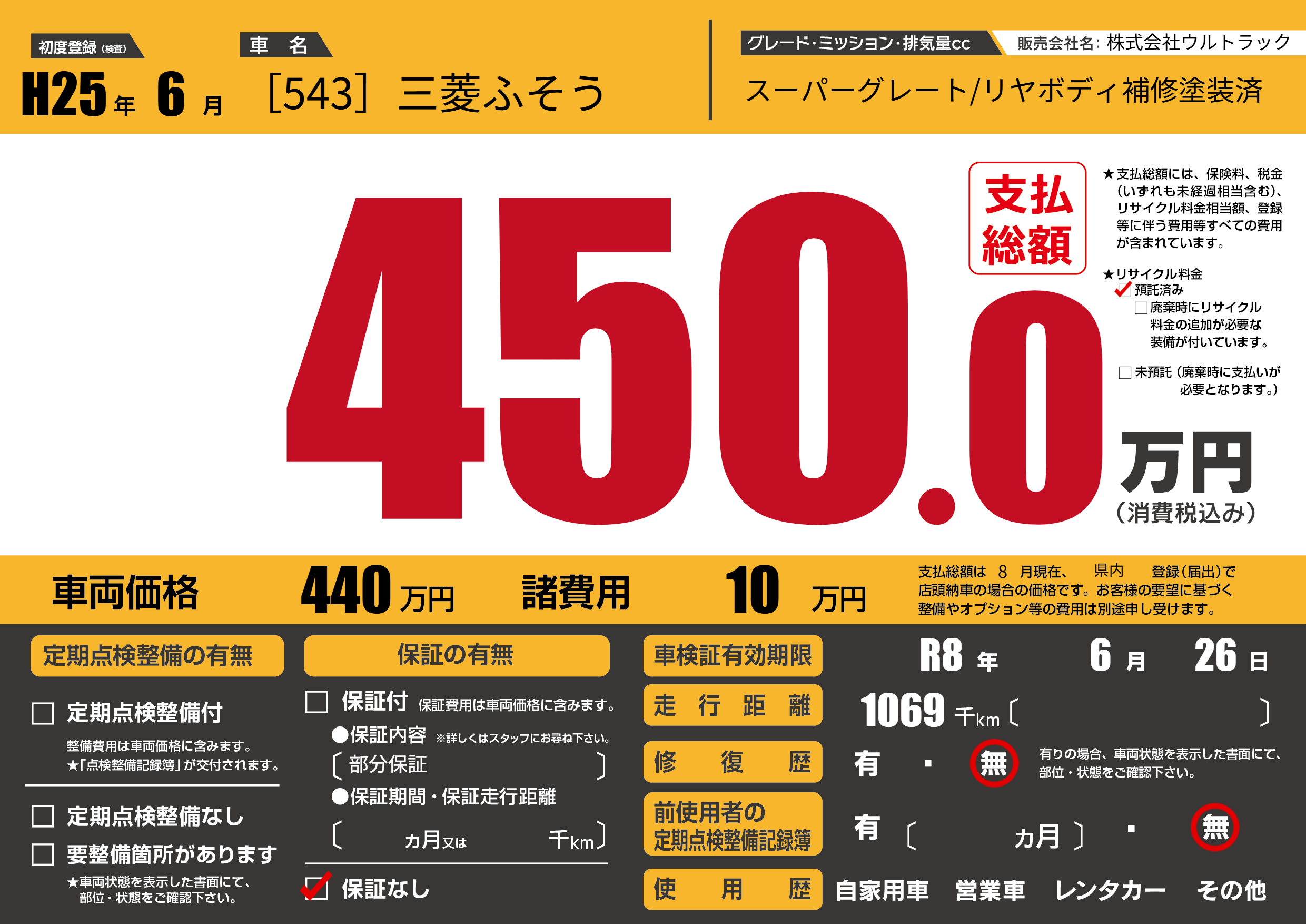 | 走行キロ | 106.9万km | 初年度登録 | H25年6月 |