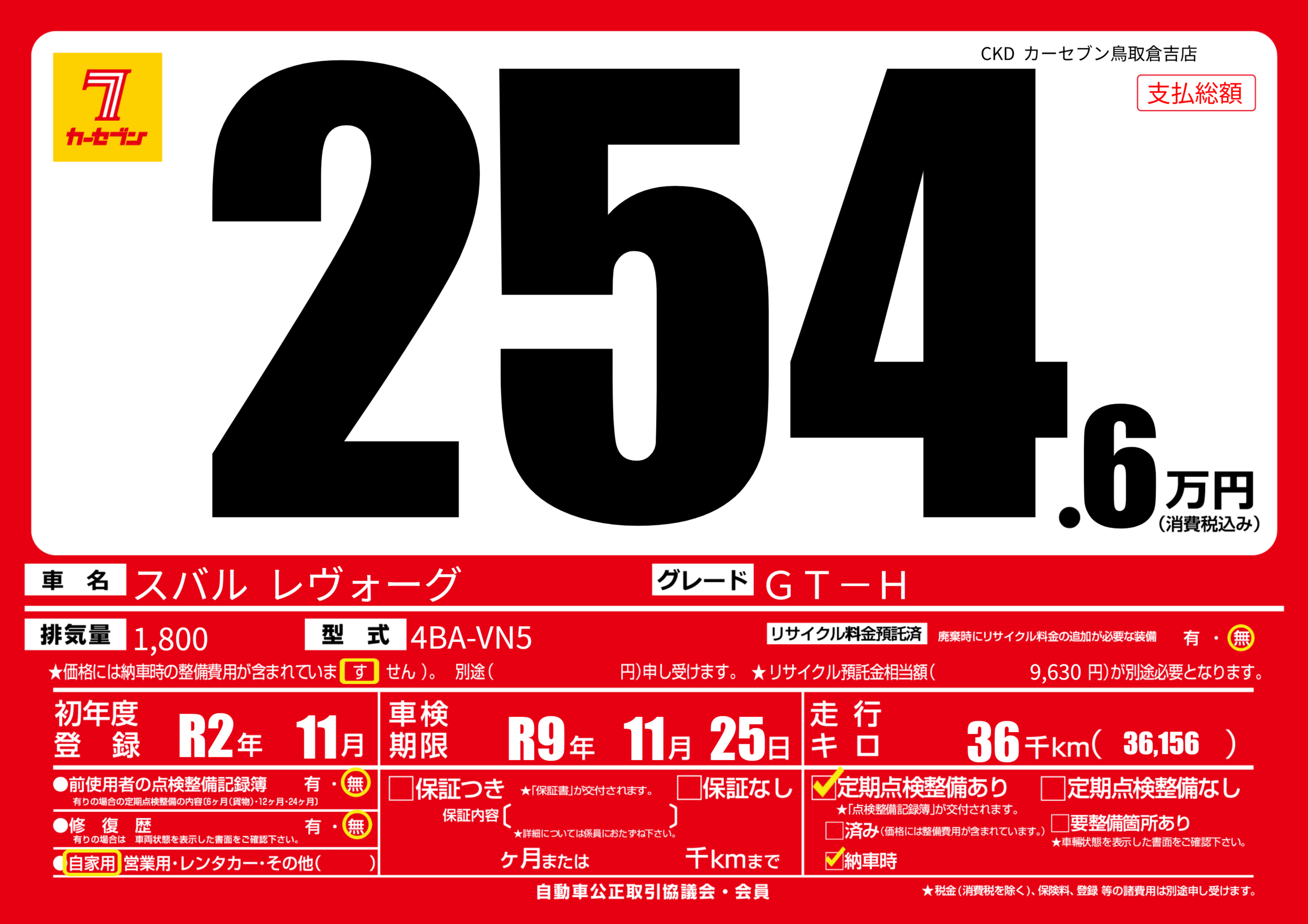| 車名 | スバル レヴォーグ | グレード ミッション 排気量 |
