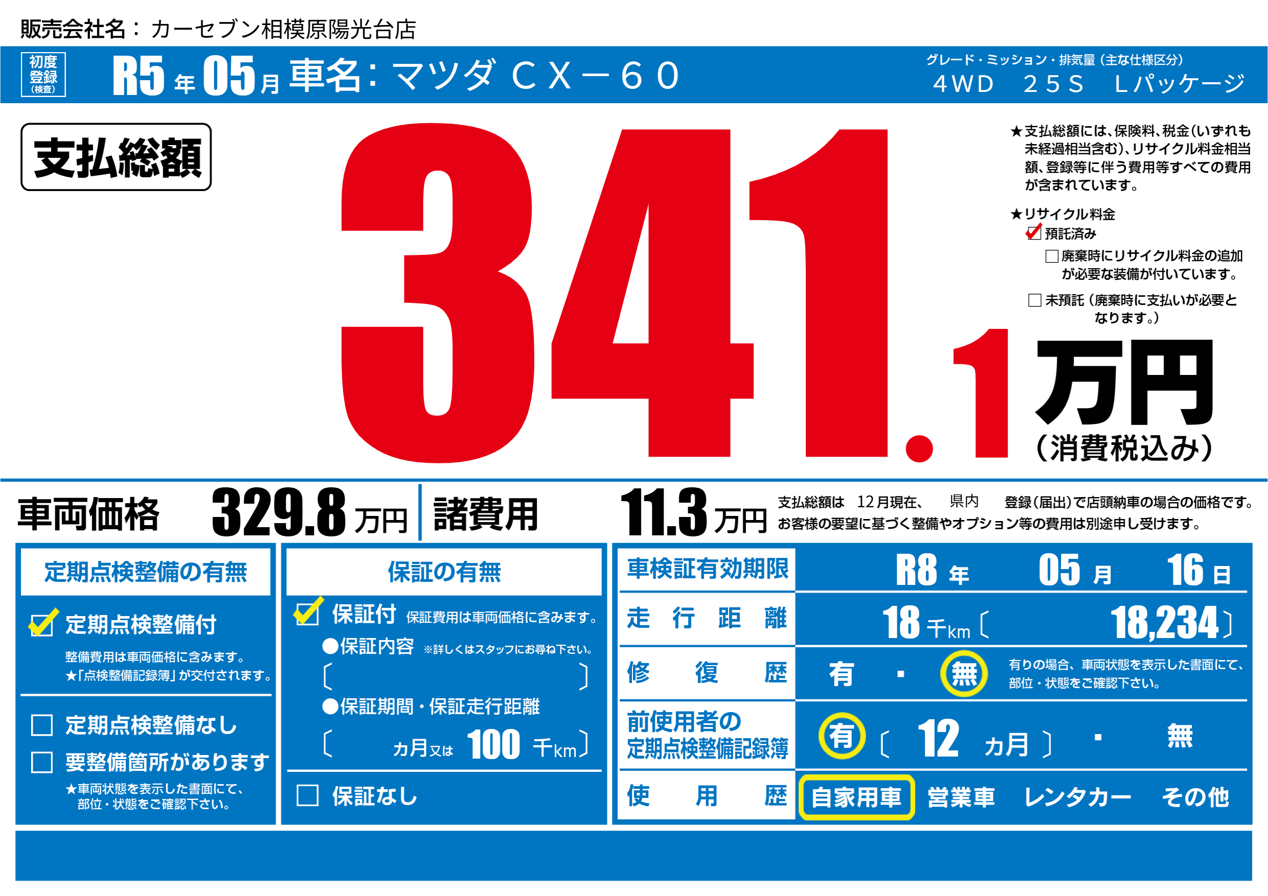 | 車名 | マツダ CX-60 | グレード ミッション 排気量 |