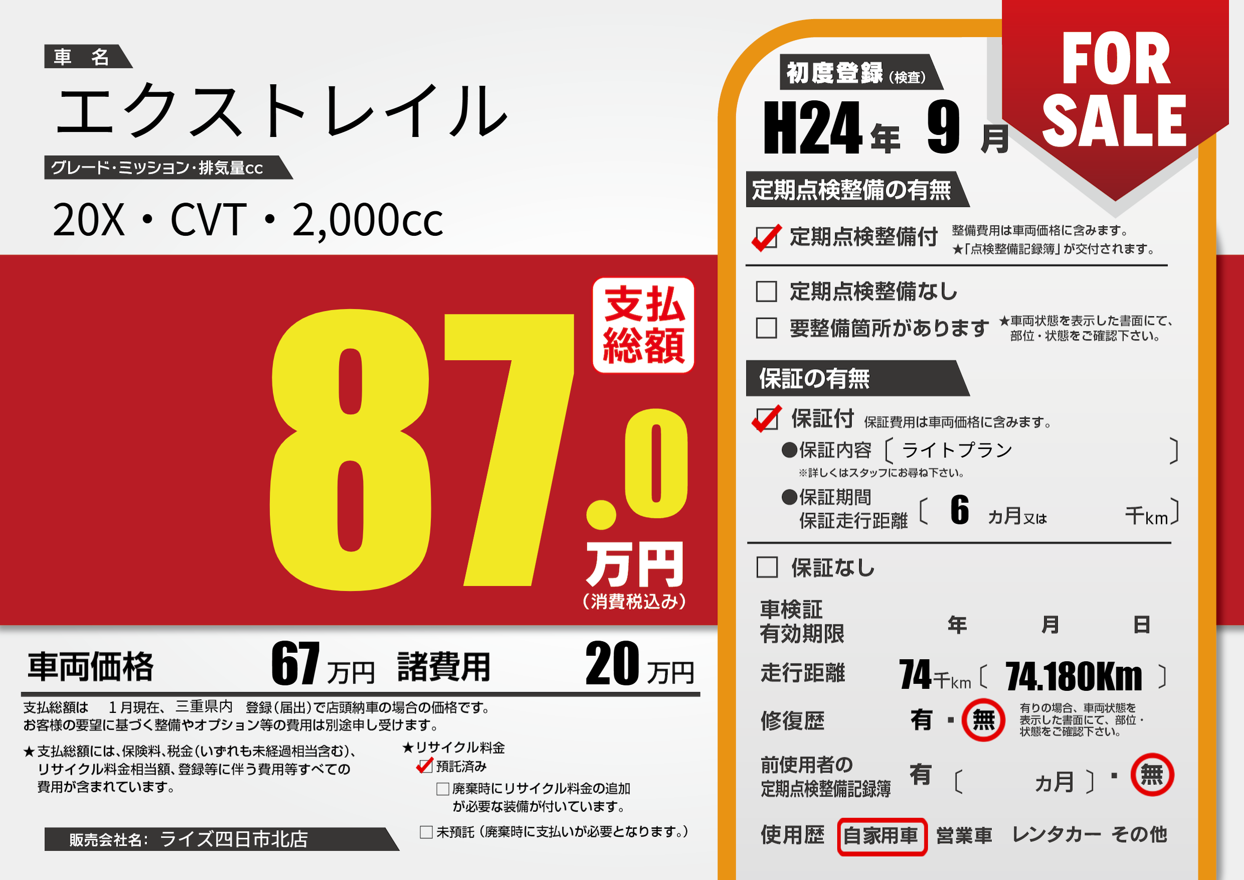| 走行キロ | 7.4万km | 初年度登録 | H24年9月 |