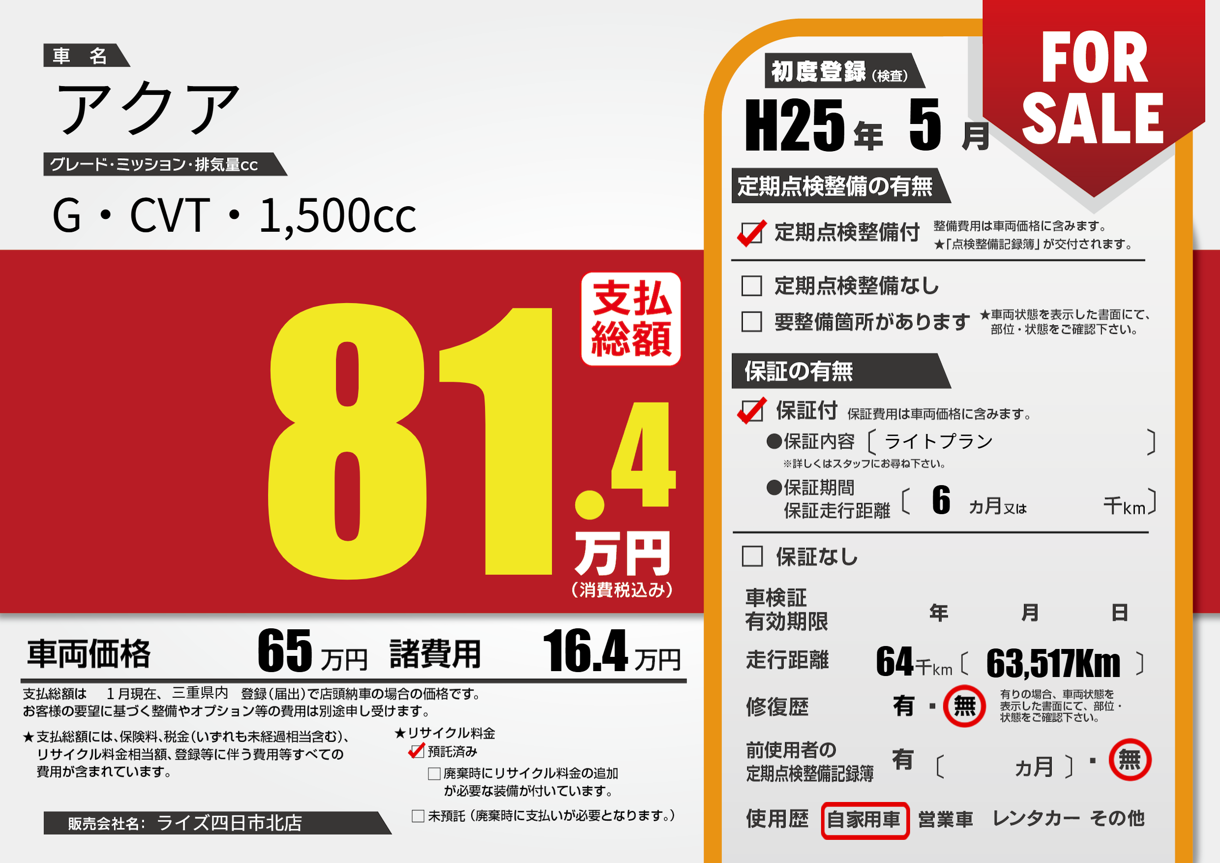 保証付き 保証内容(ライトプラン) 6ヶ月または千km |