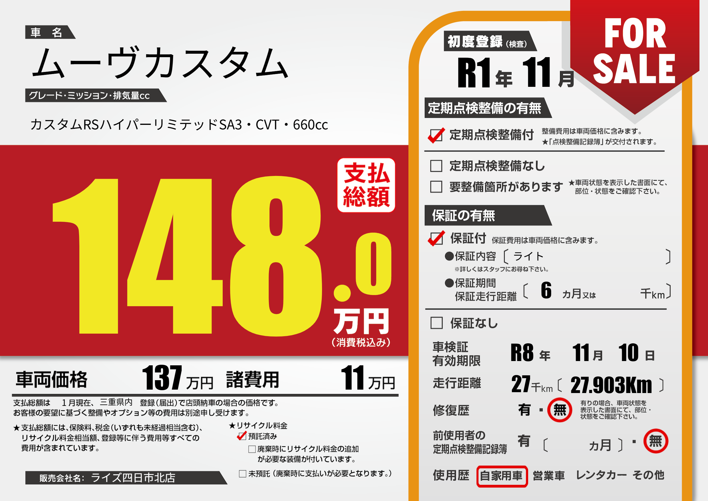 | 走行キロ | 2.7万km | 初年度登録 | R1年11月 |