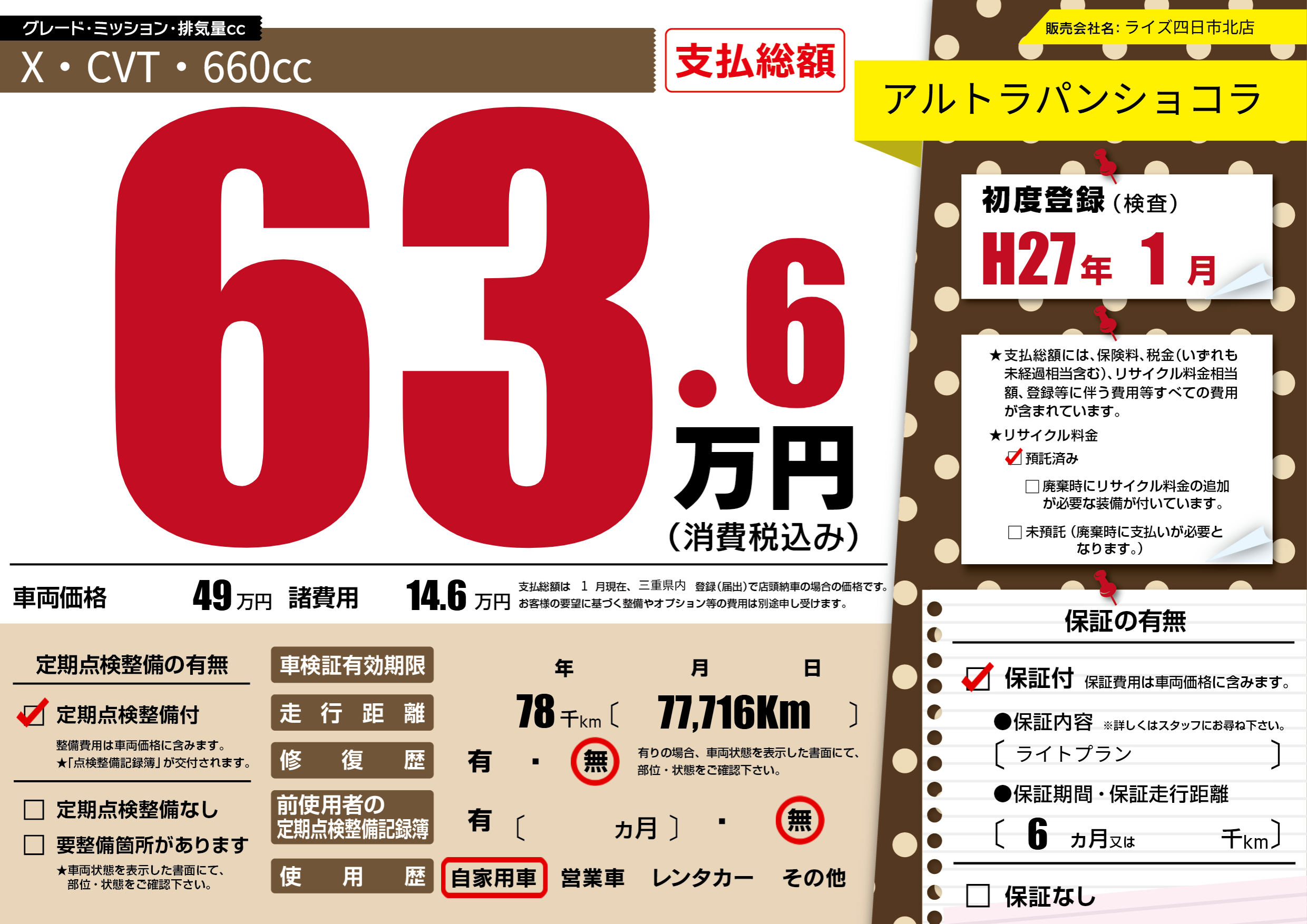 | 走行キロ | 7.8万km | 初年度登録 | H27年1月 |