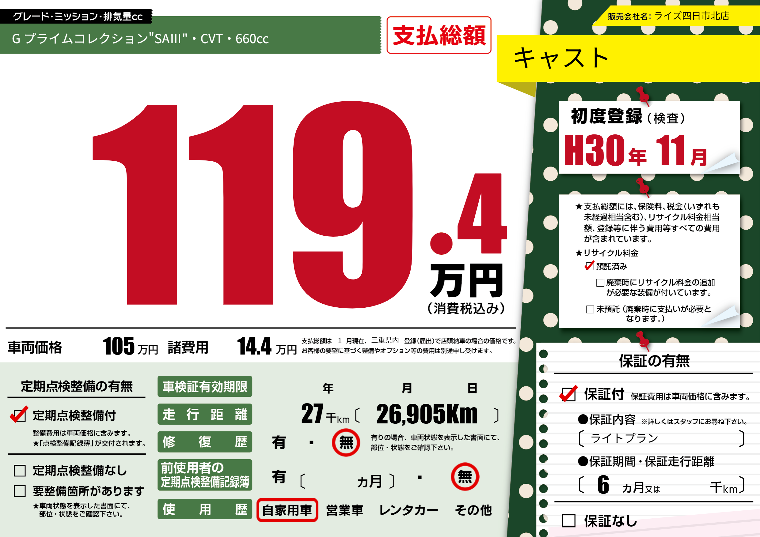 | 車名 | キャスト | グレード ミッション 排気量 |