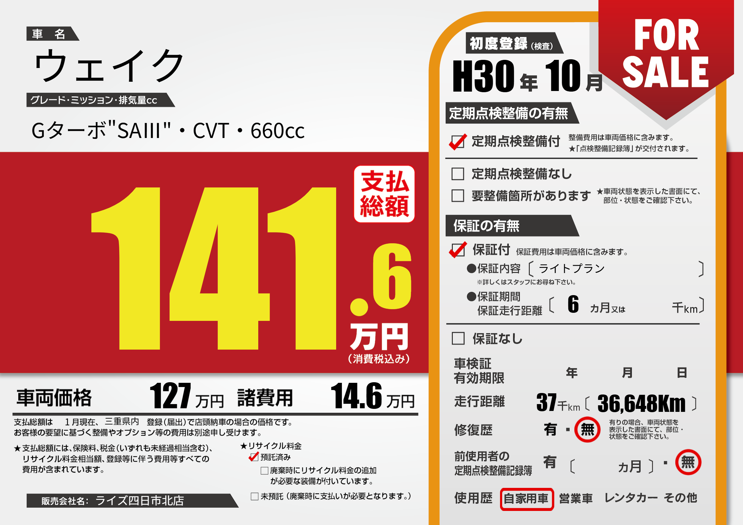 | 走行キロ | 3.7万km | 初年度登録 | H30年10月 |