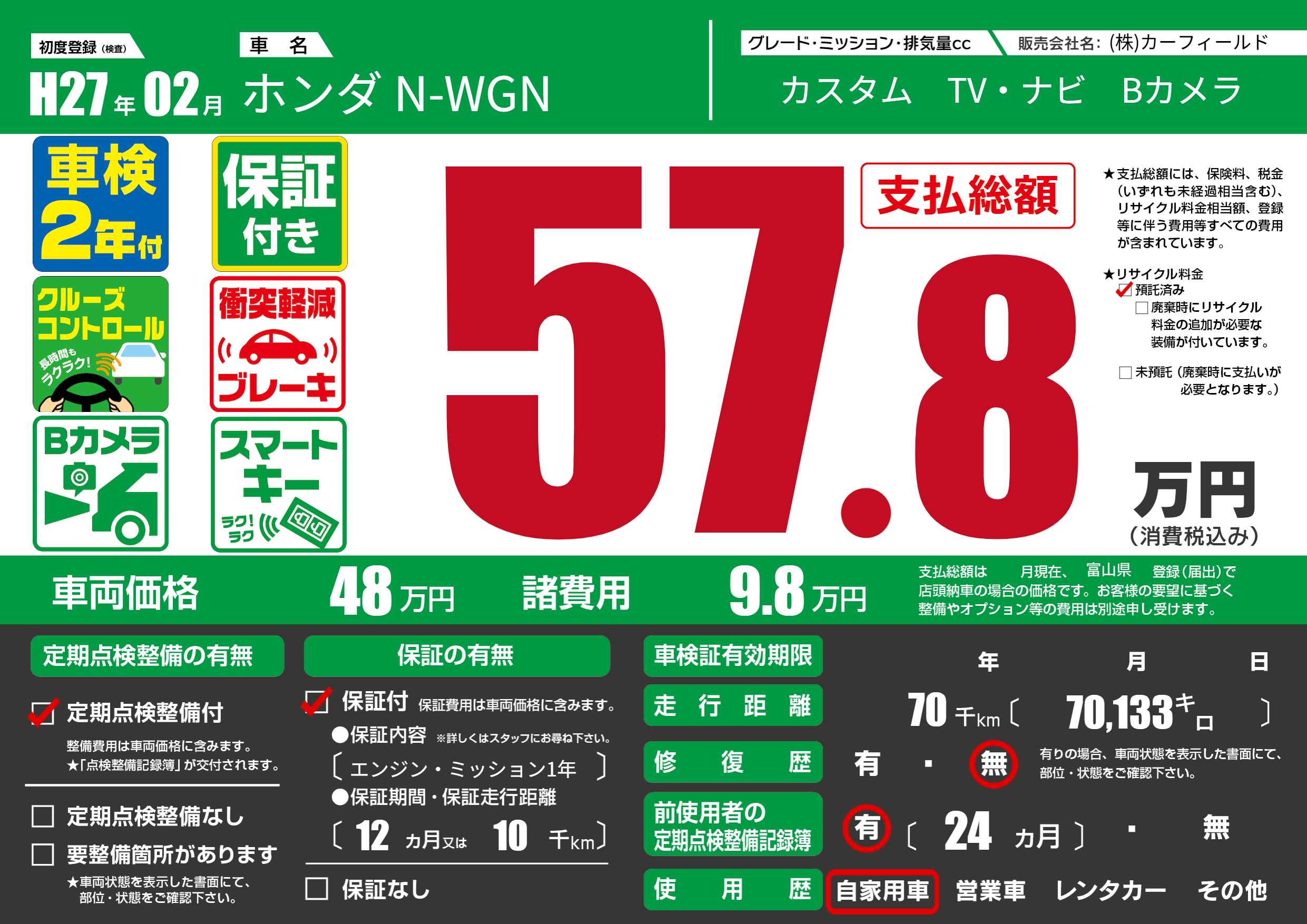 | 車名 | ホンダ N-WGN | グレード ミッション 排気量 |
