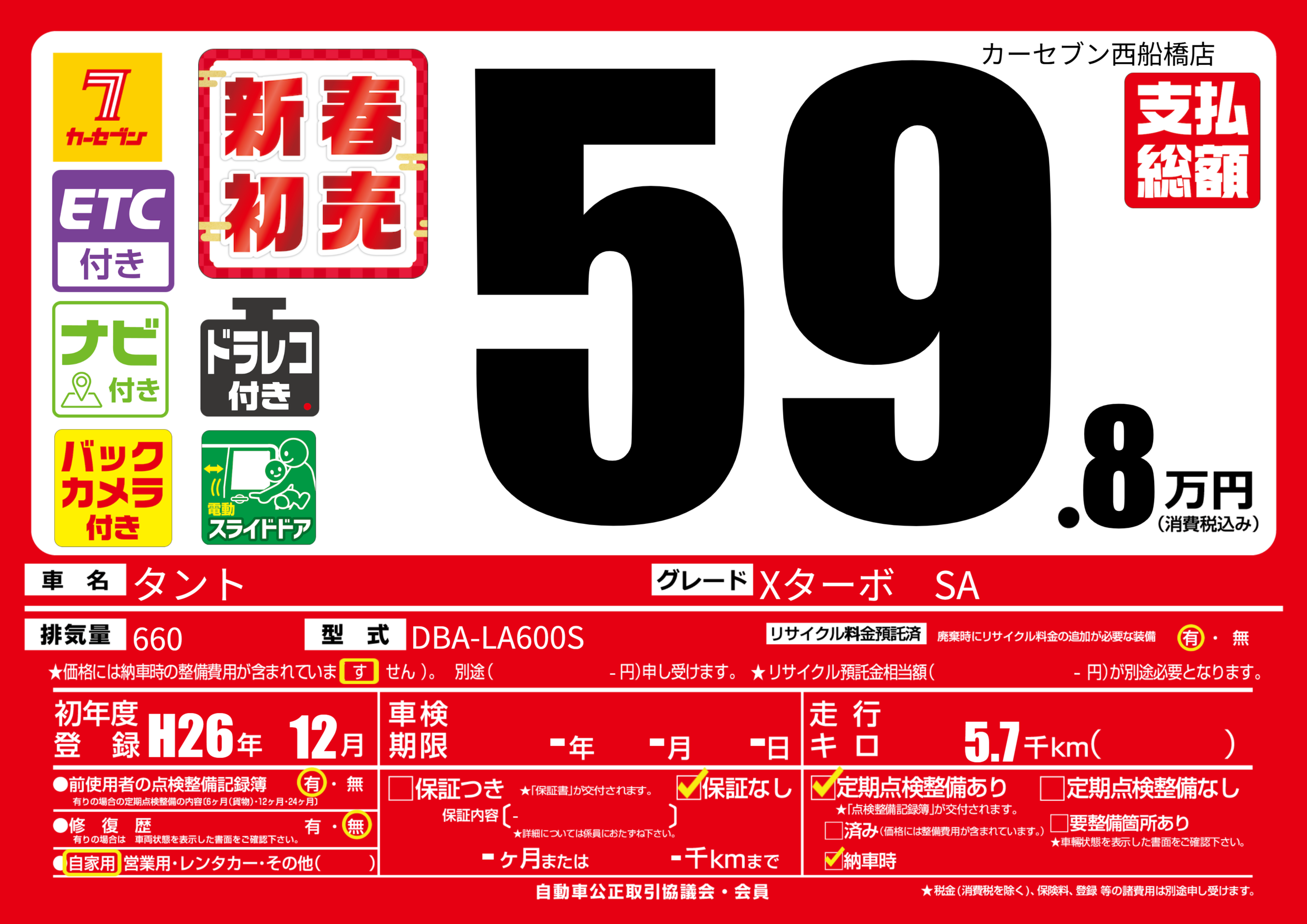 | 走行キロ | 0.5万km | 初年度登録 | H26年12月 |