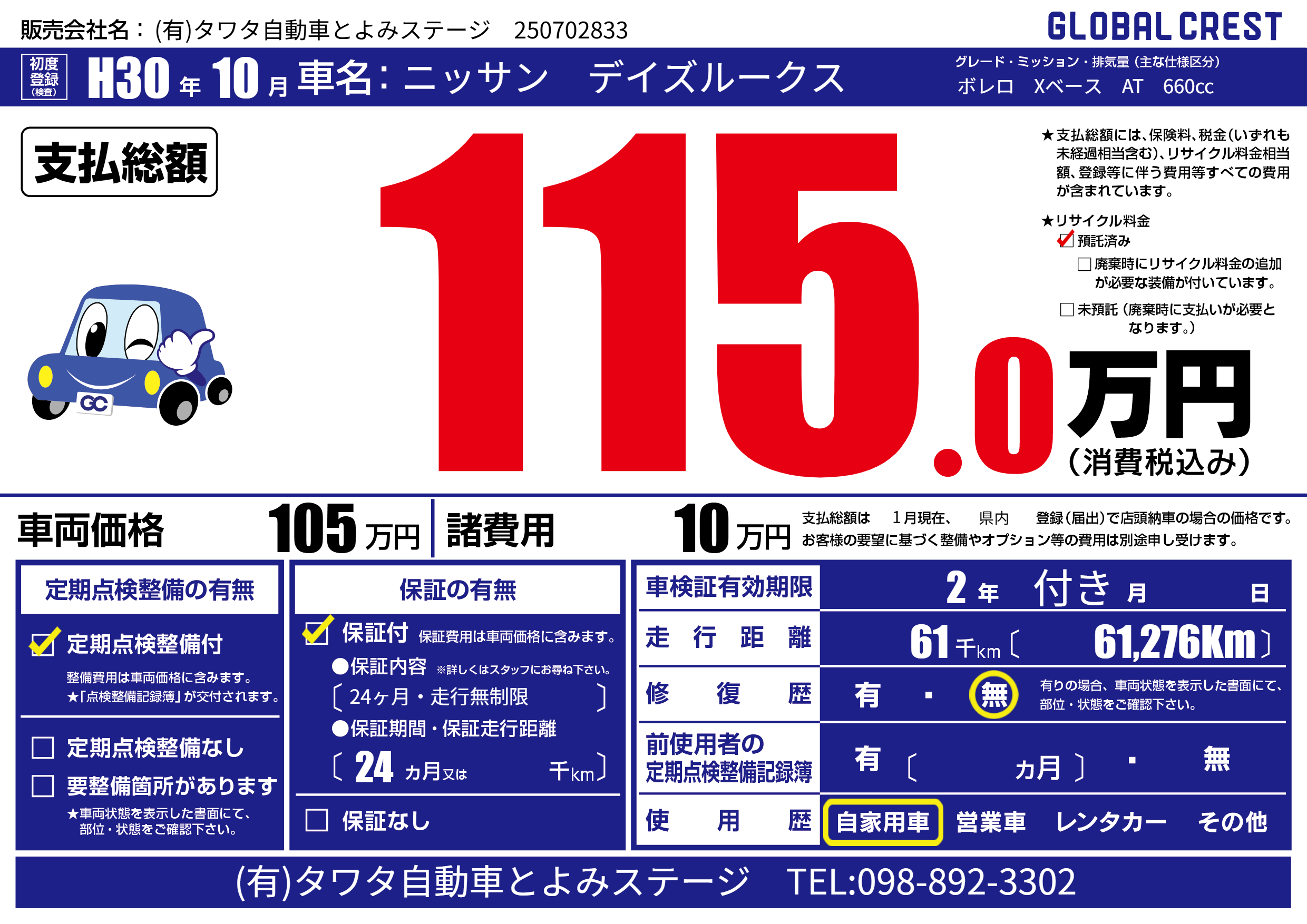 | 車名 | ニッサン デイズルークス | グレード ミッション 排気量 |