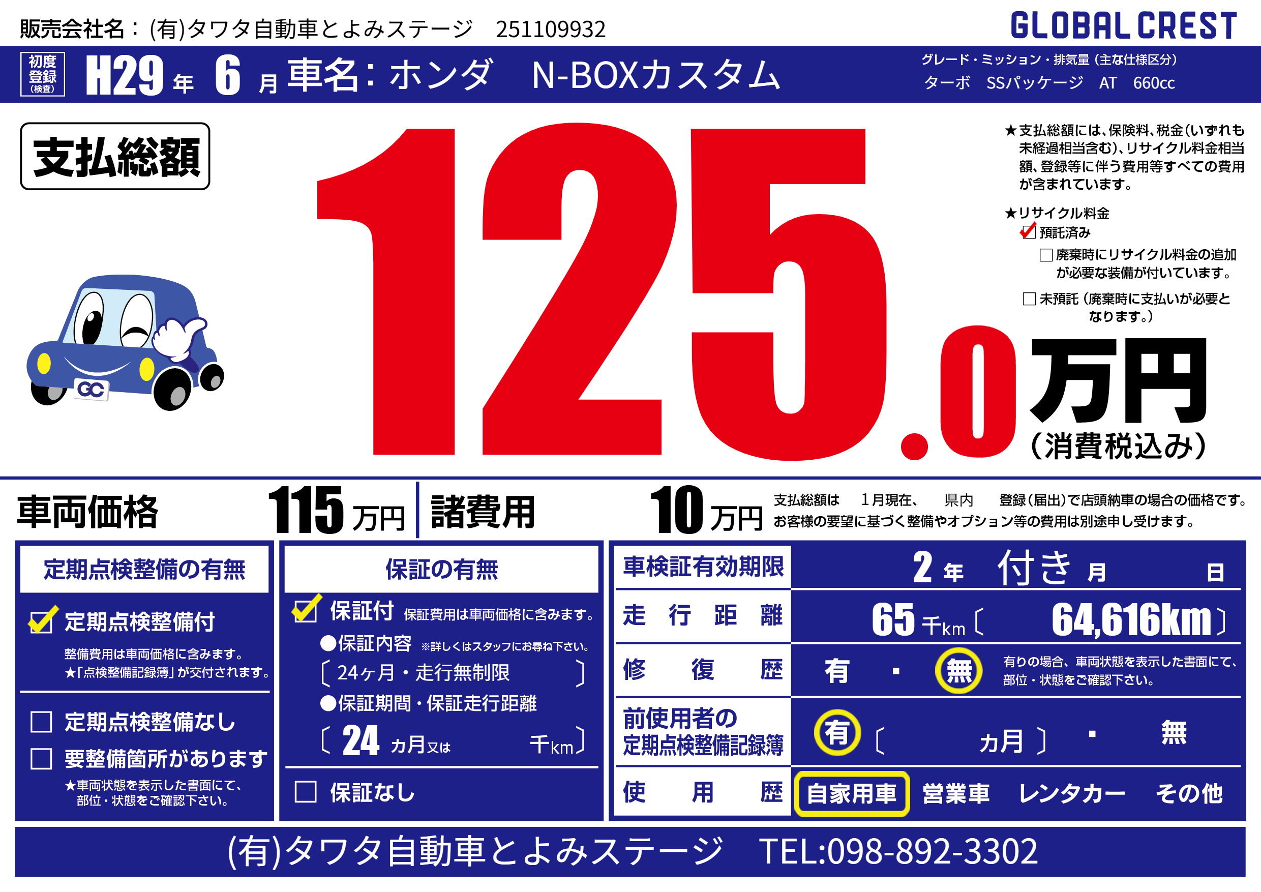 | 走行キロ | 6.5万km | 初年度登録 | H29年6月 |