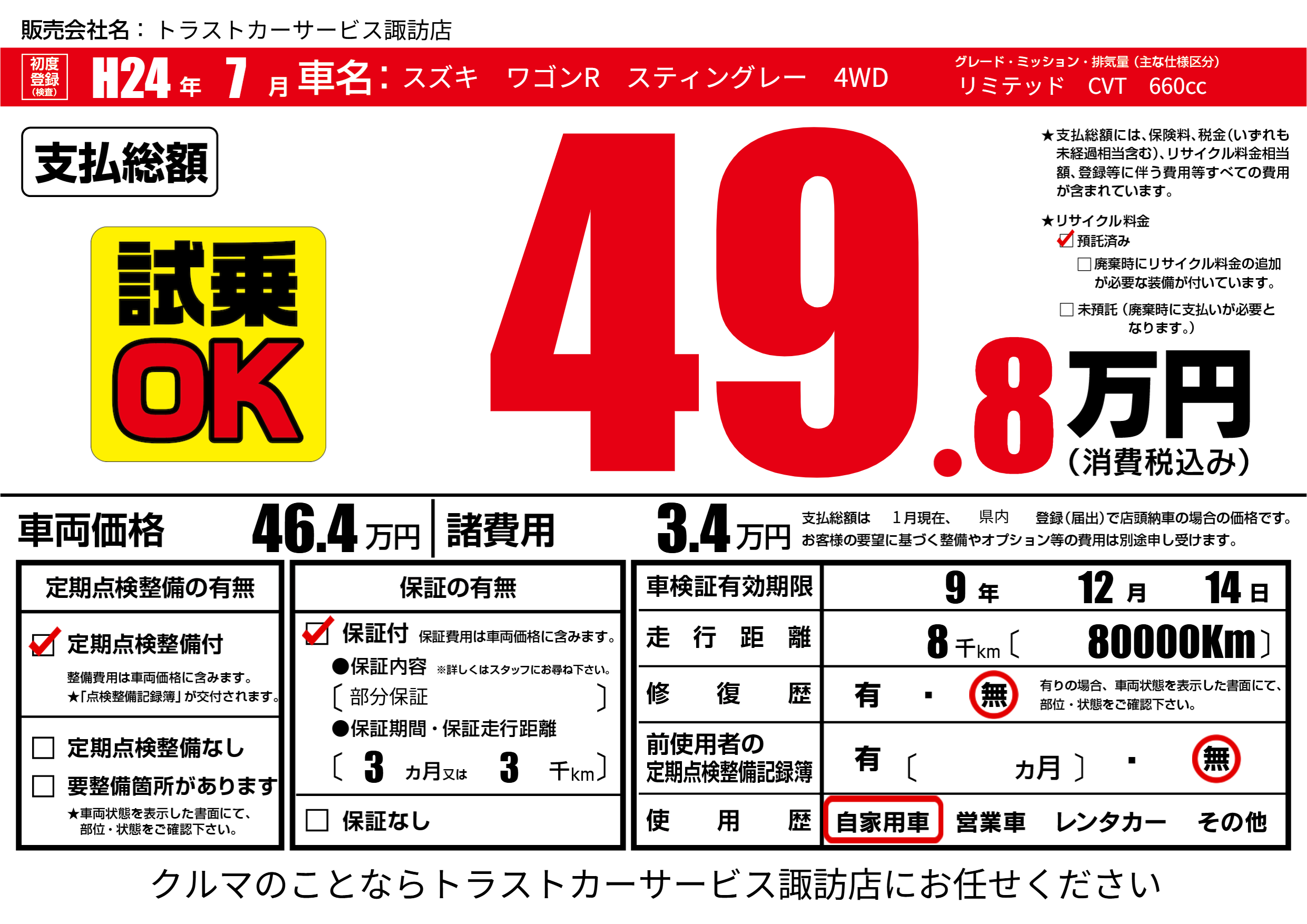 | 車名 | スズキ ワゴンR スティングレー 4WD | グレード ミッション 排気量 |