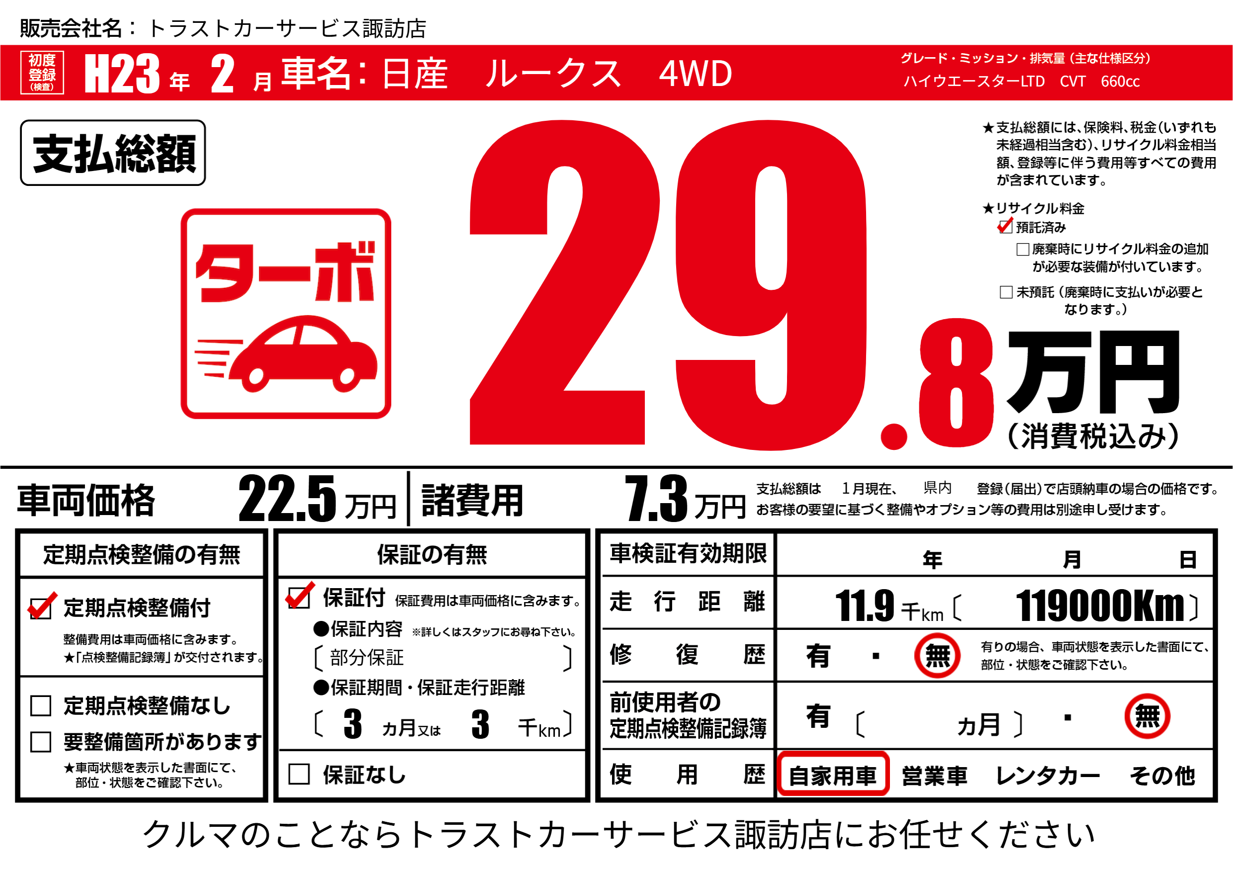 | 走行キロ | 1.1万km | 初年度登録 | H23年2月 |