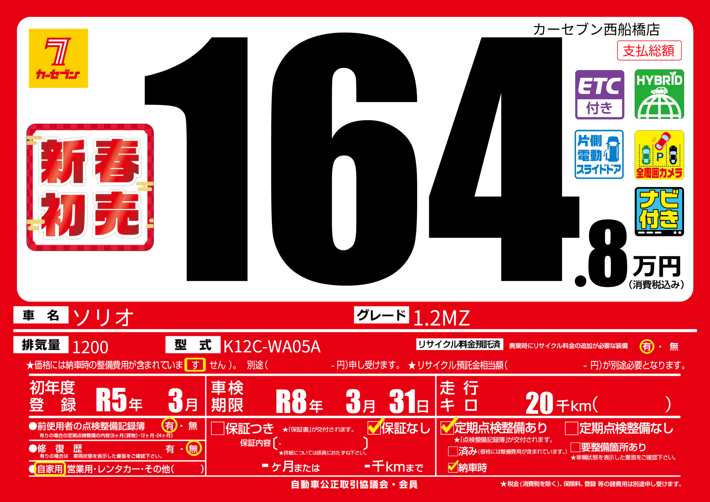 | 走行キロ | 2万km | 初年度登録 | R5年3月 |