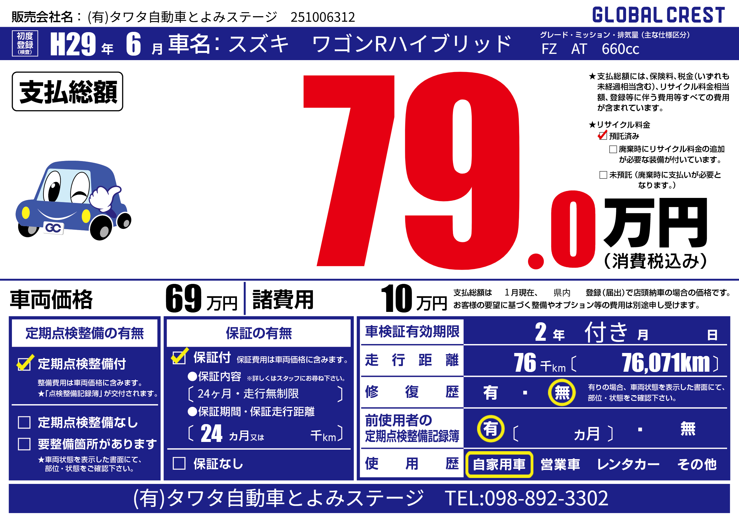 | 車名 | スズキ ワゴンRハイブリッド | グレード ミッション 排気量 |