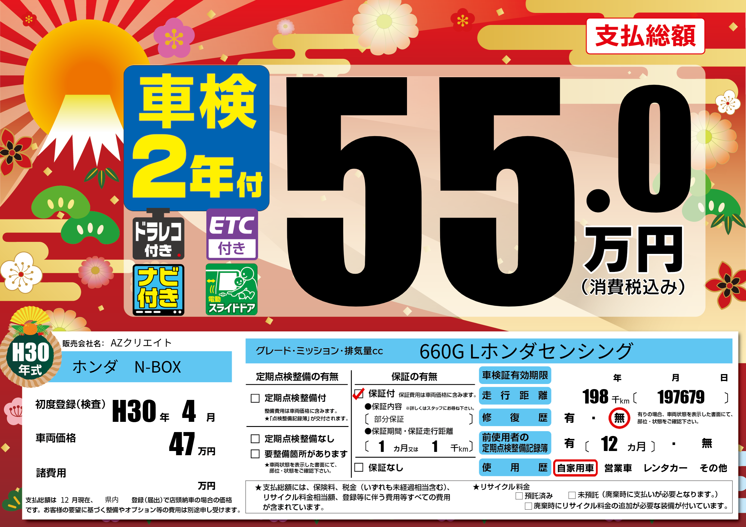 | 走行キロ | 19.8万km | 初年度登録 | H30年4月 |