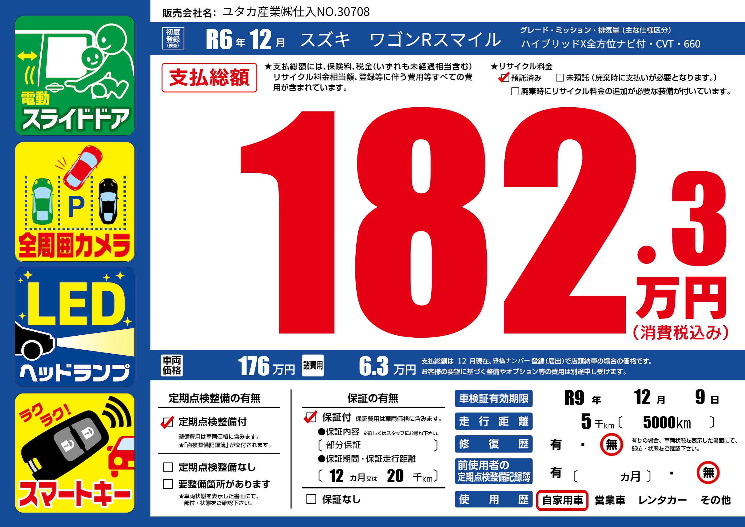 | 走行キロ | 0.5万km | 初年度登録 | R6年12月 |