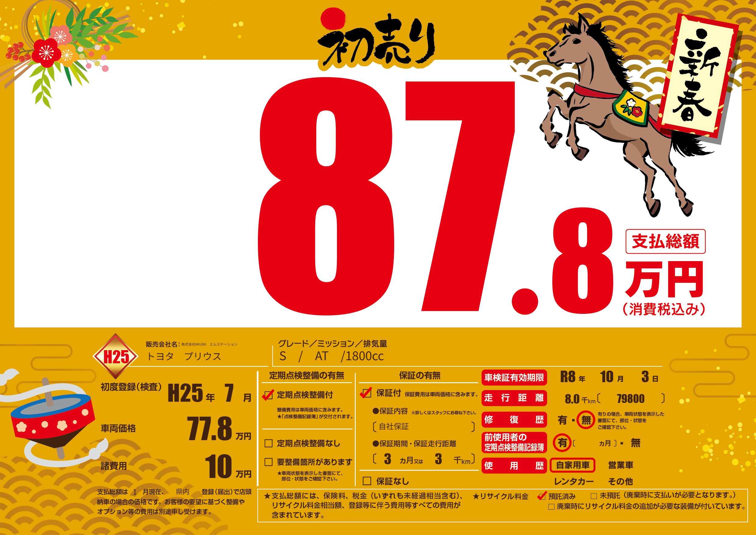 | 走行キロ | 0.8万km | 初年度登録 | H25年7月 |