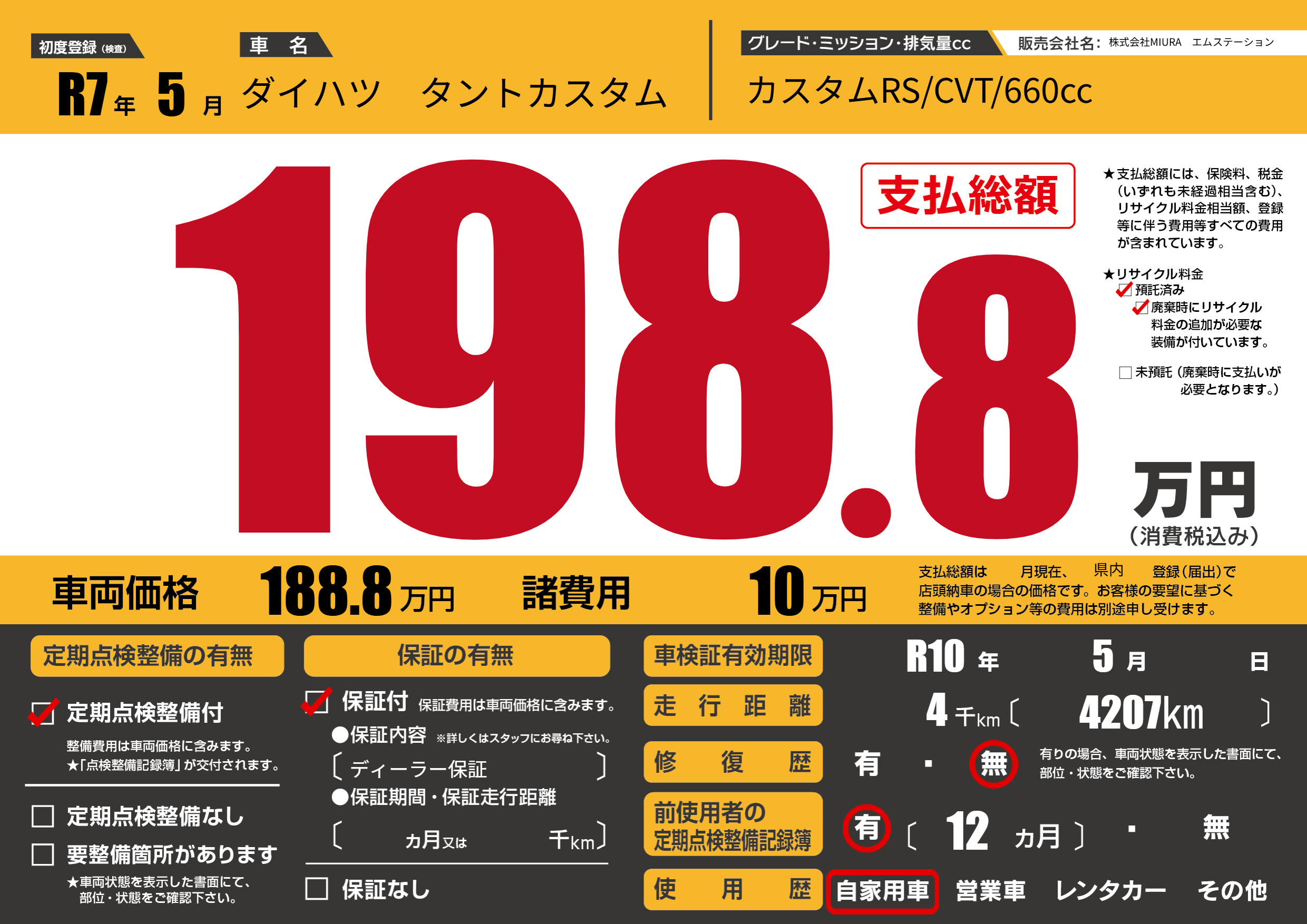 | 車名 | ダイハツ タントカスタム | グレード ミッション 排気量 |