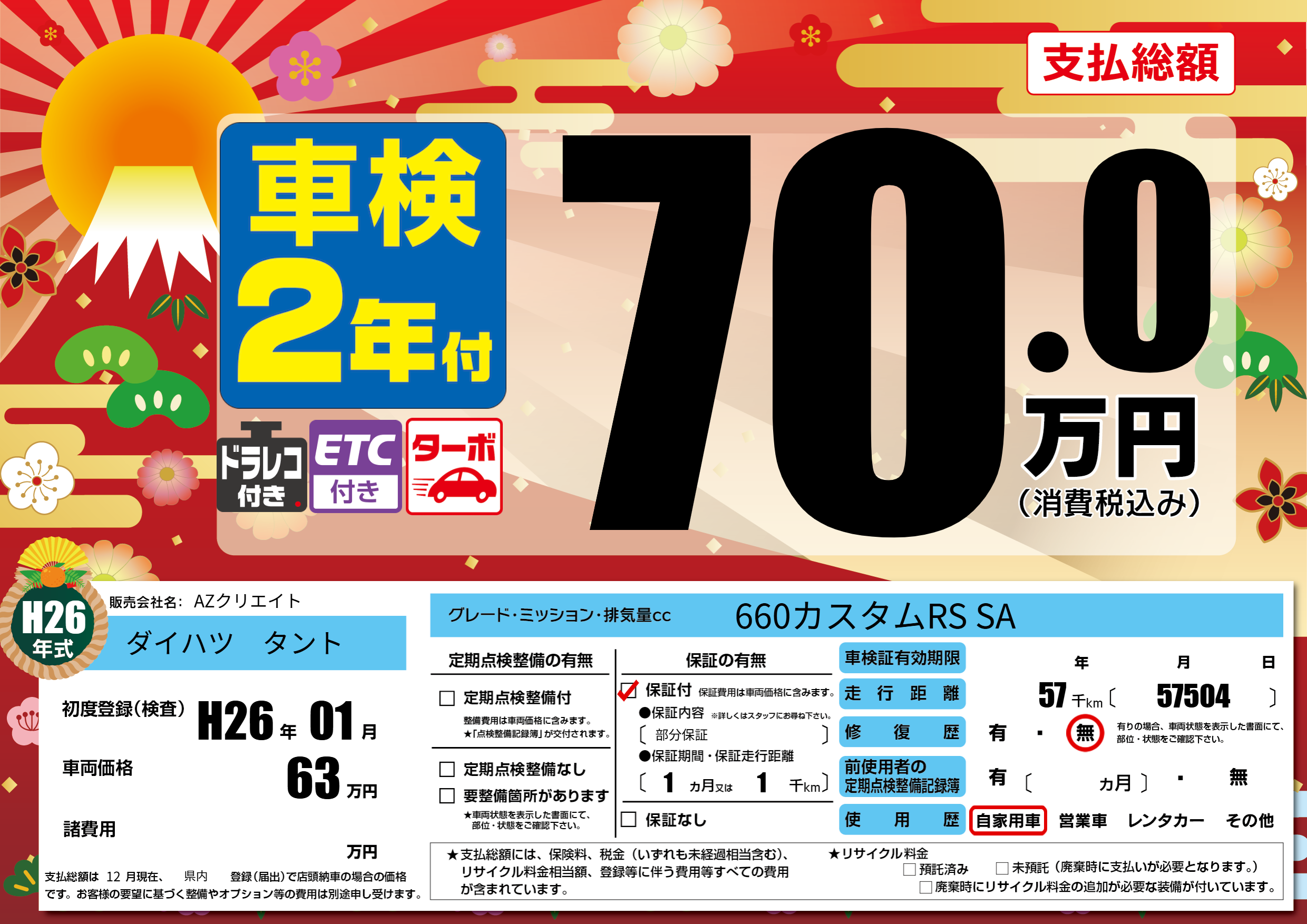 | 車名 | ダイハツ タント | グレード ミッション 排気量 |