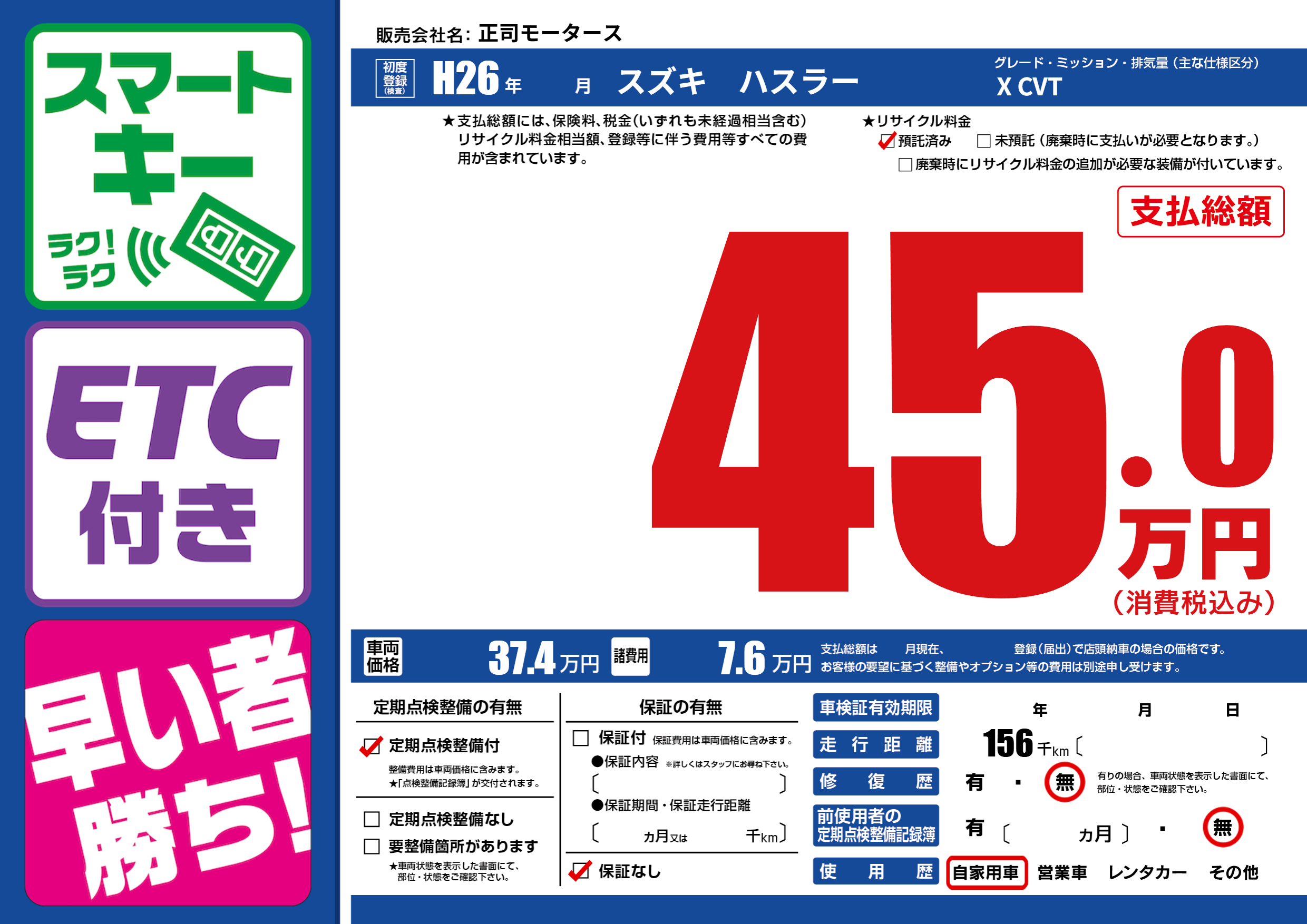| 走行キロ | 15.6万km | 初年度登録 | H26年---月 |