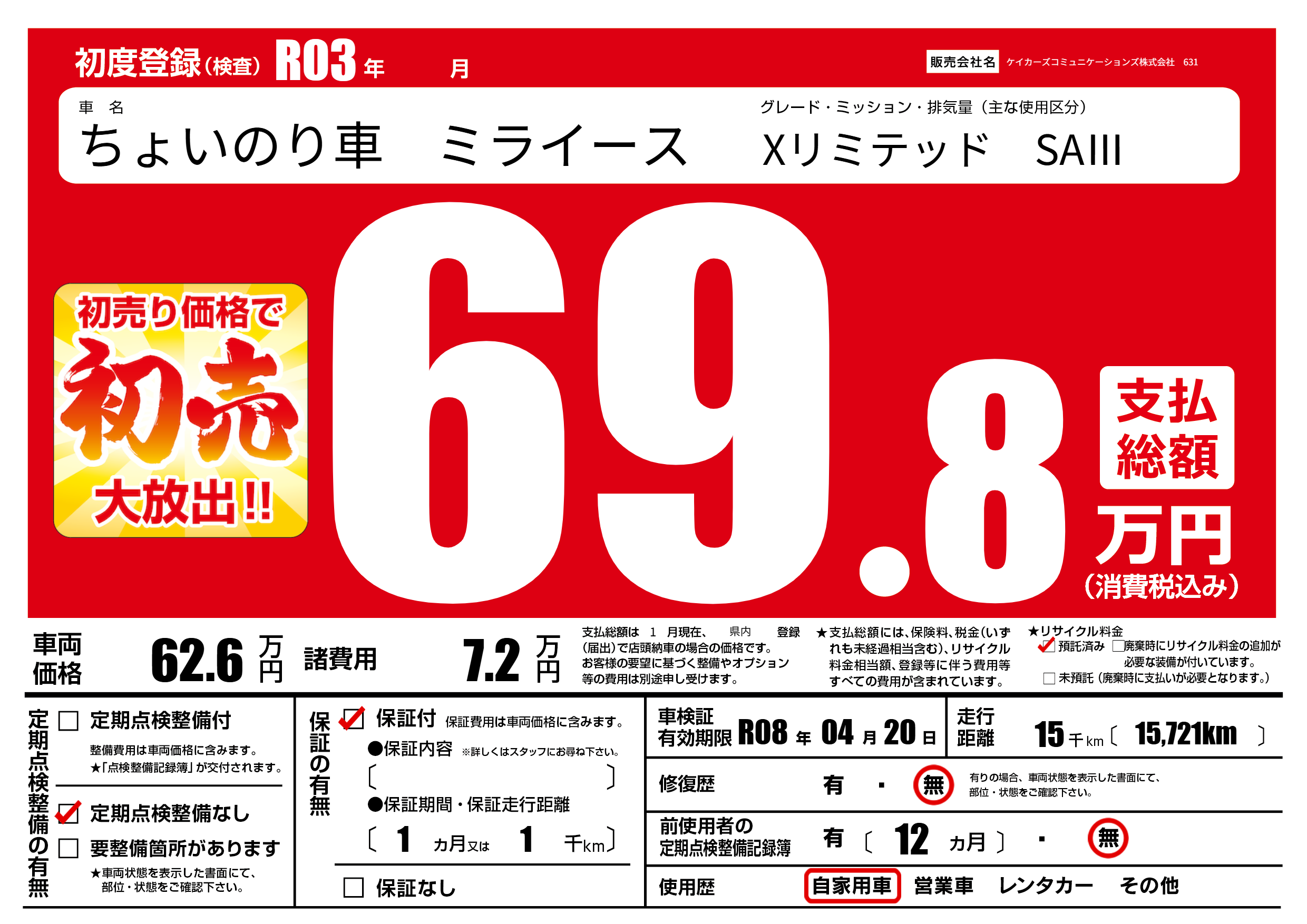 なし | 車検制限 | R08年04月20月 |