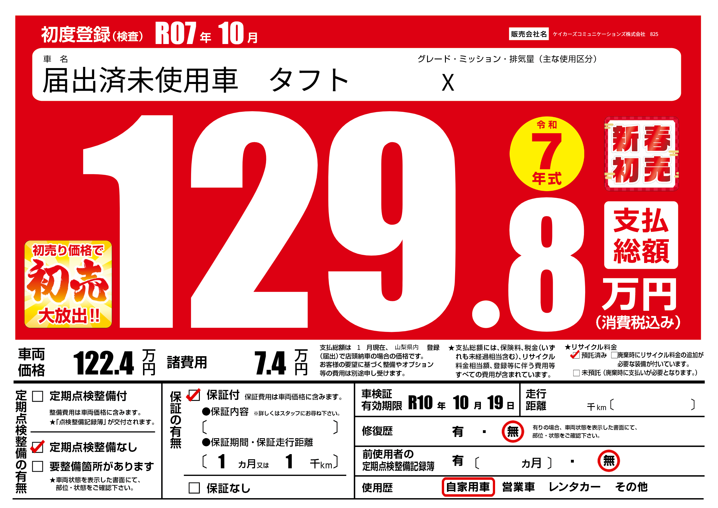 | 走行キロ | - | 初年度登録 | R07年10月 |