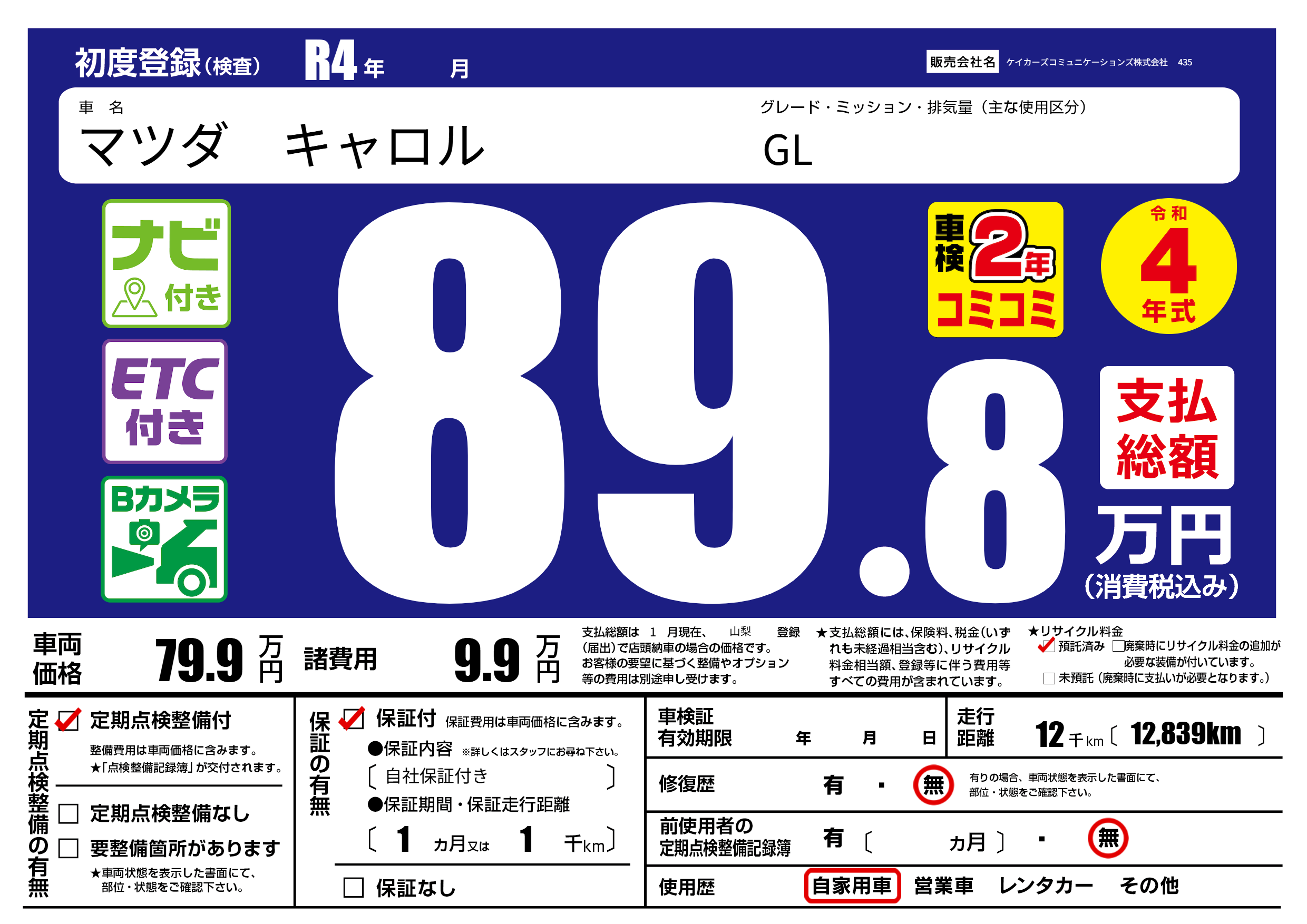 | 車名 | マツダ キャロル | グレード ミッション 排気量 |