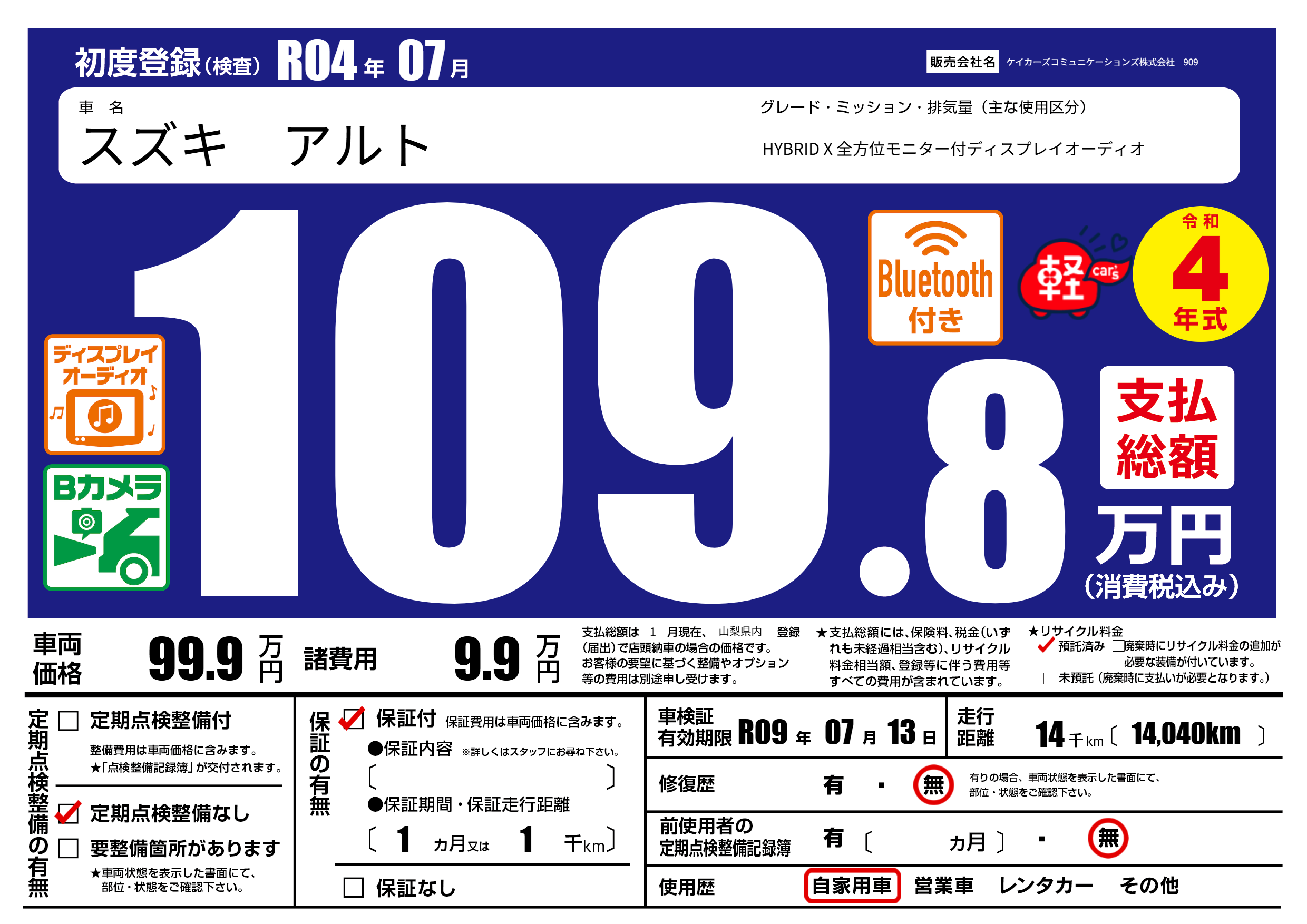 | 車名 | スズキ アルト | グレード ミッション 排気量 |