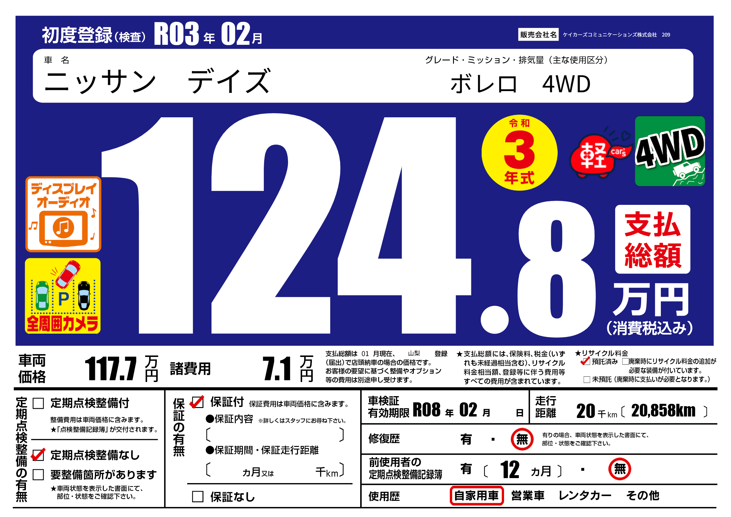 | 車名 | ニッサン デイズ | グレード ミッション 排気量 |