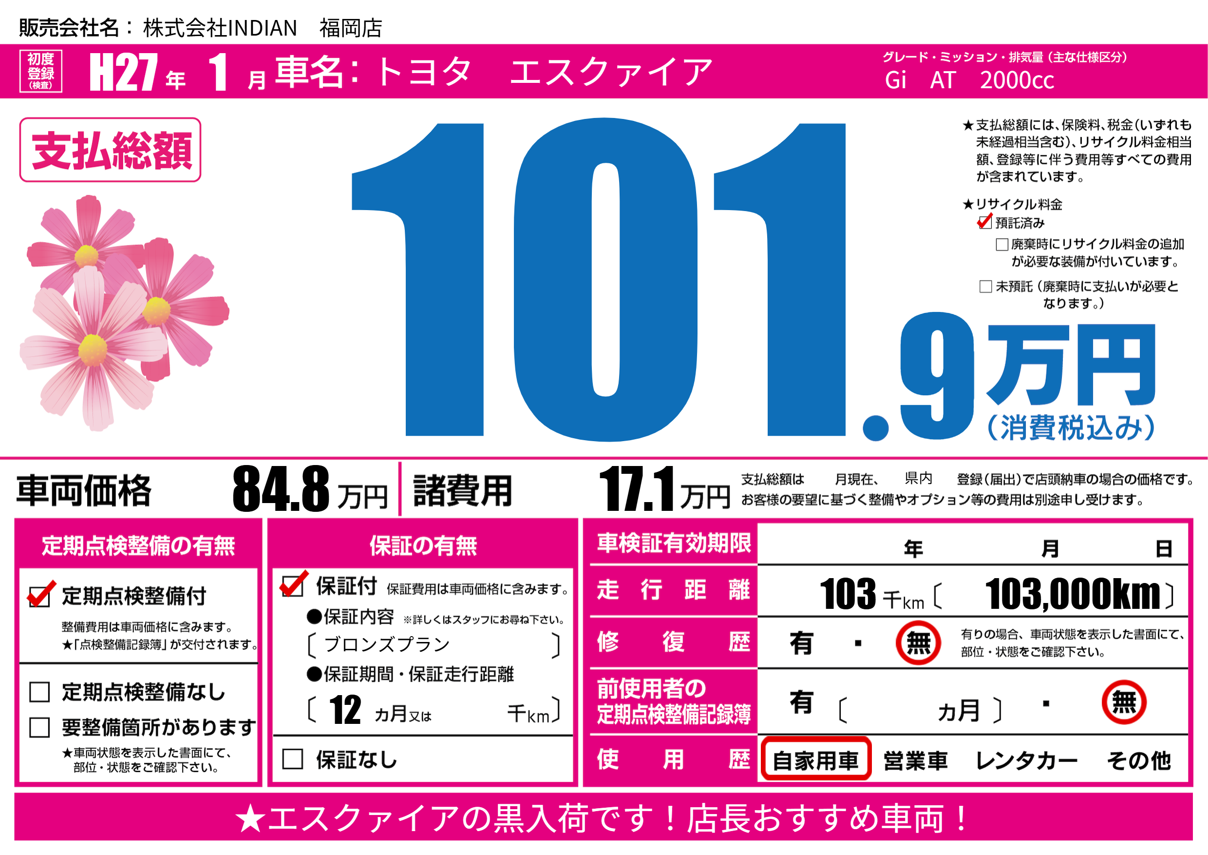 | 初年度登録 | H27年1月 | ||