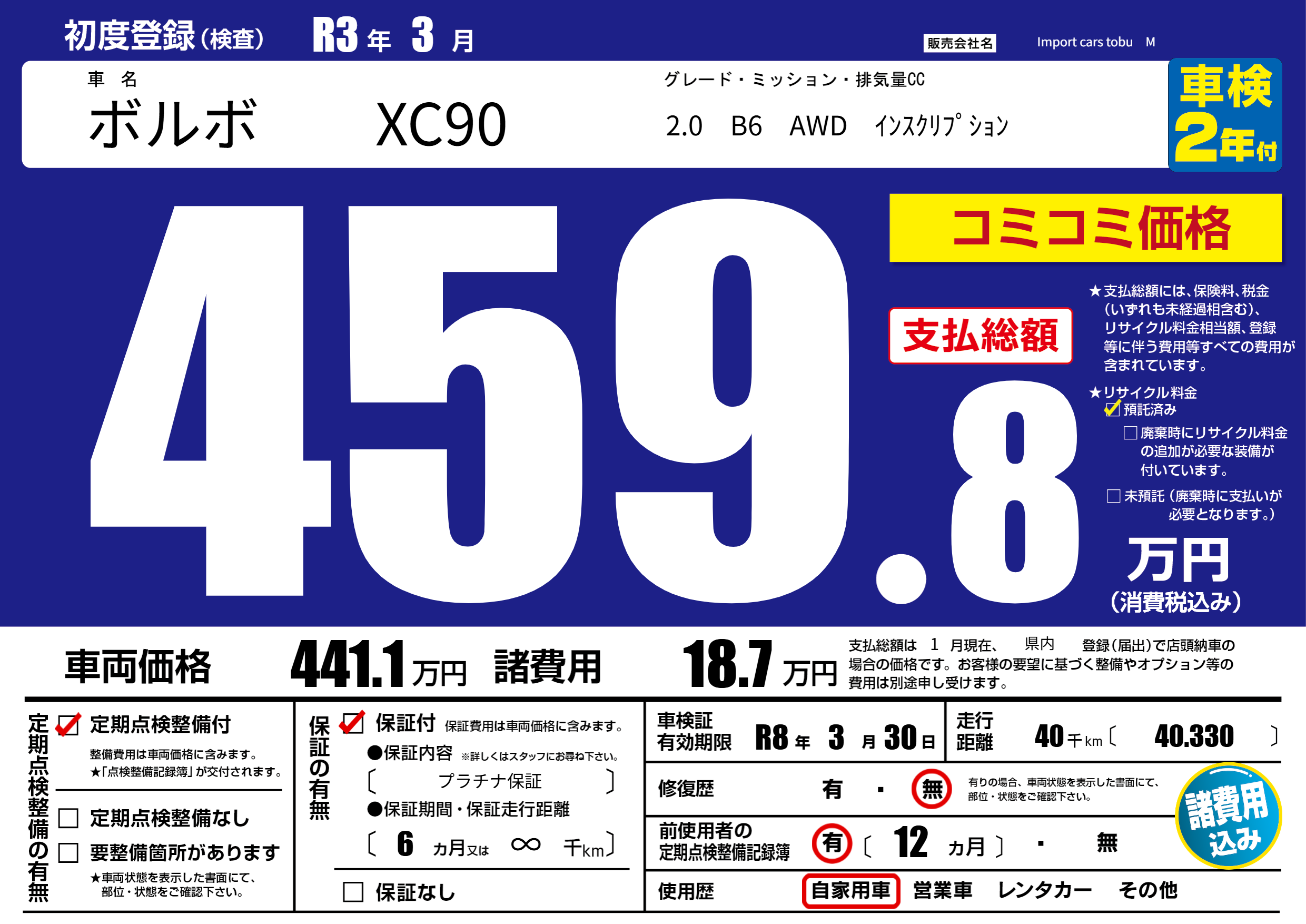 保証付き 保証内容( プラチナ保証) 6ヶ月または(∞)千kmまで |