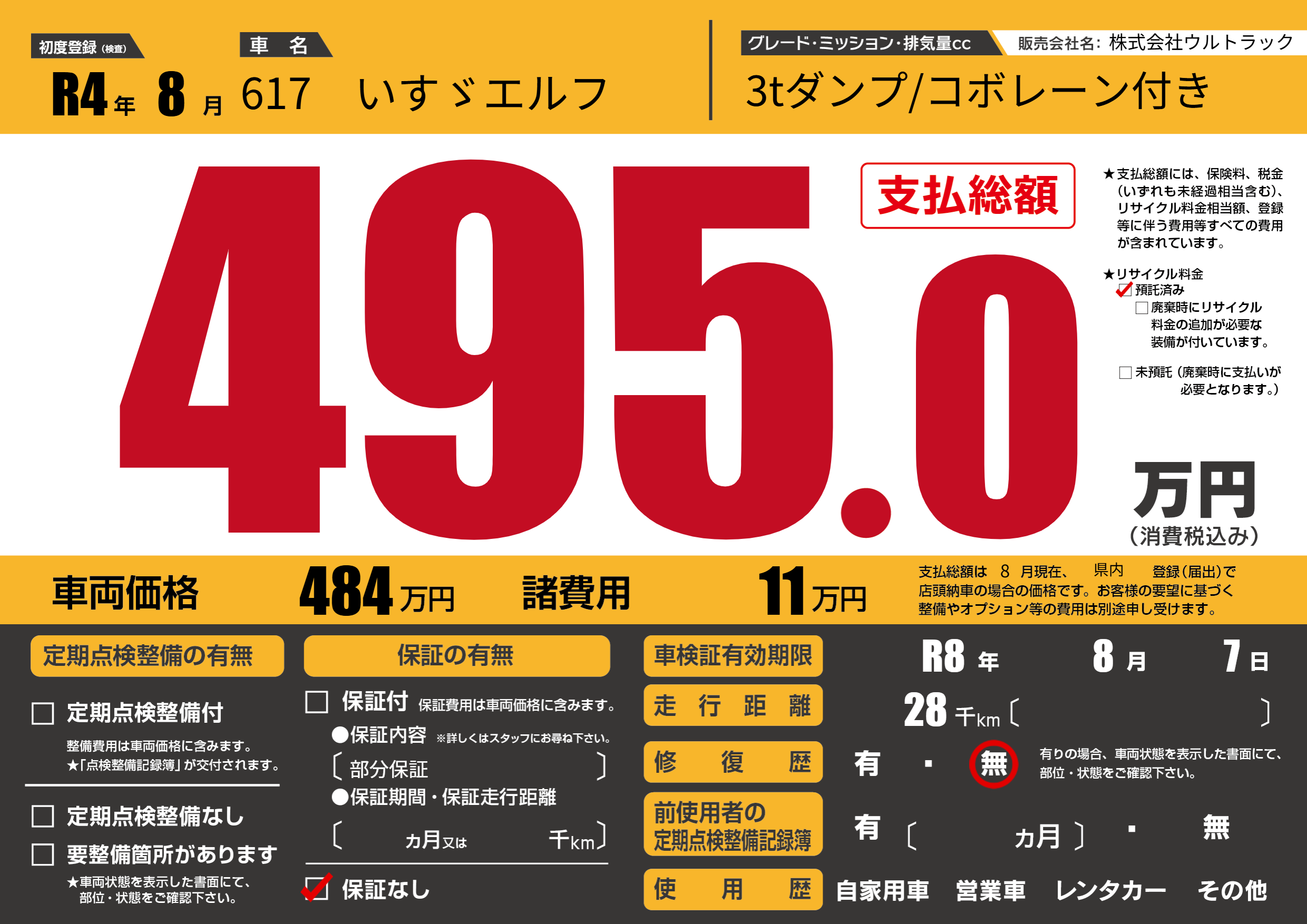 | 車名 | 617 いすゞエルフ | グレード ミッション 排気量 |