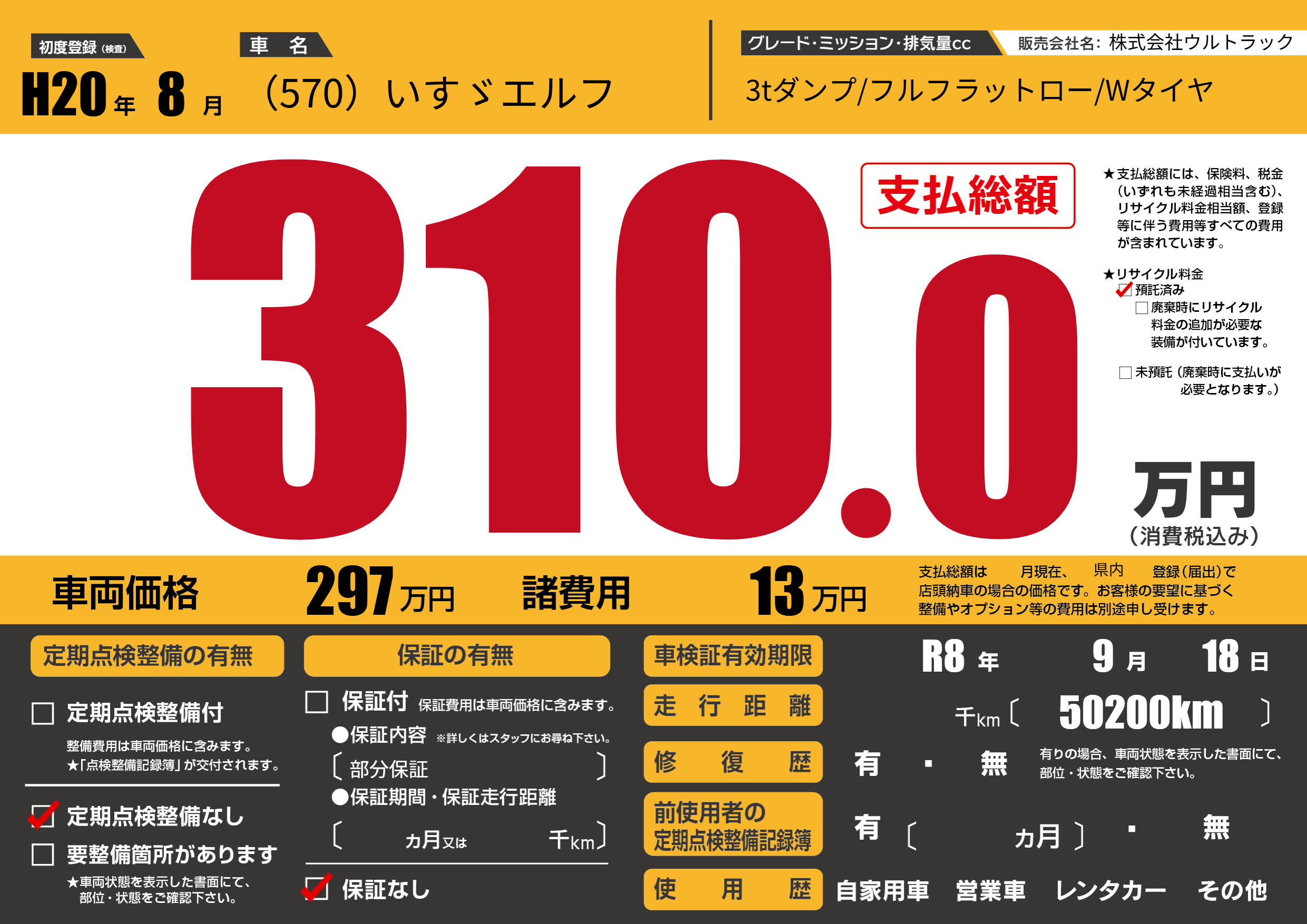 保証なし 保証内容(部分保証) ---ヶ月または()千kmまで |