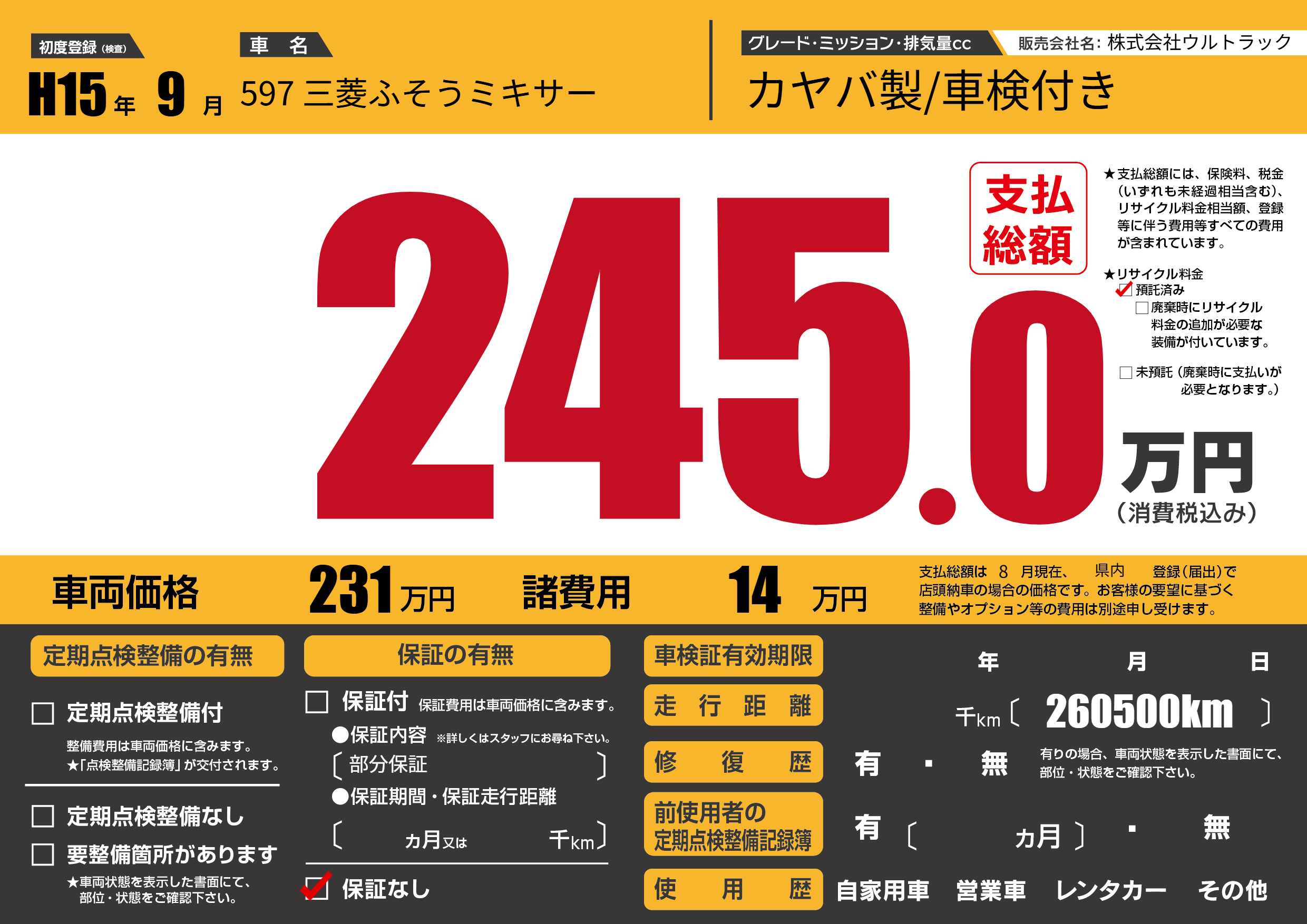 | 走行キロ | - | 初年度登録 | H15年9月 |
